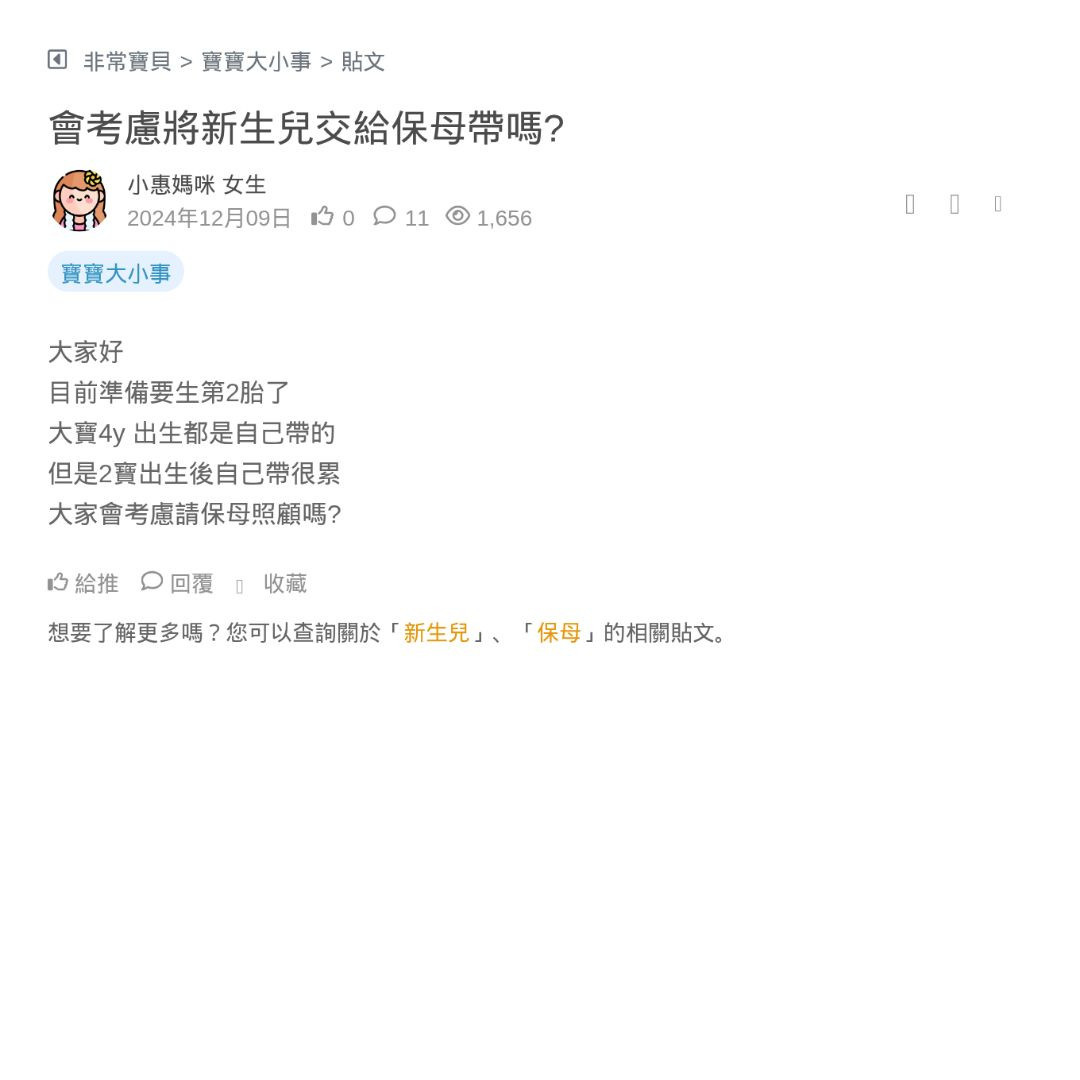大家好,我的嫩嬰快滿三個月了,最近正在考慮何時送去托嬰? 如果現在就送托嬰,寶寶會不會容易生病,老師真的能好好照顧嗎? 看更多