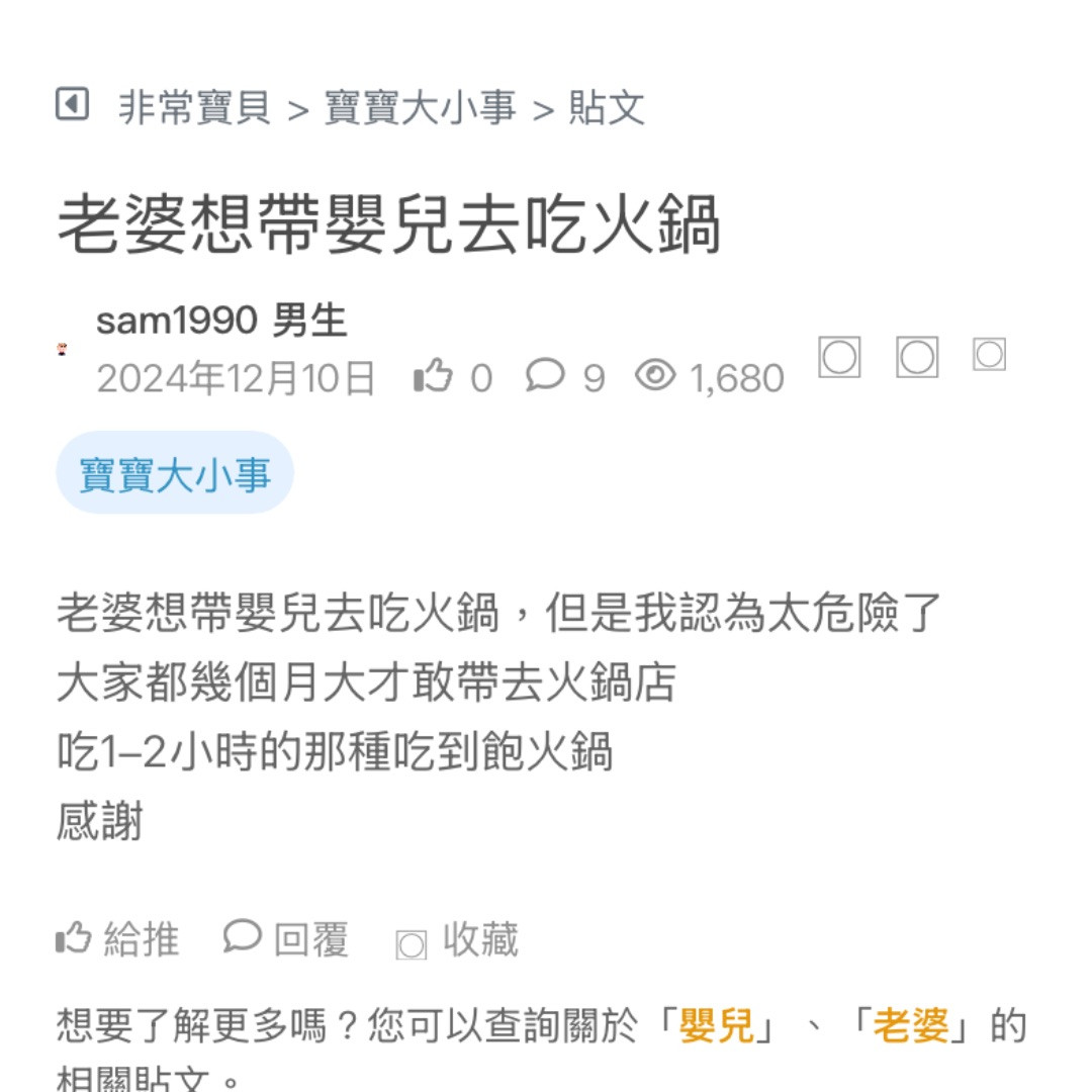 老婆想帶嬰兒去吃火鍋,但是我認為太危險了