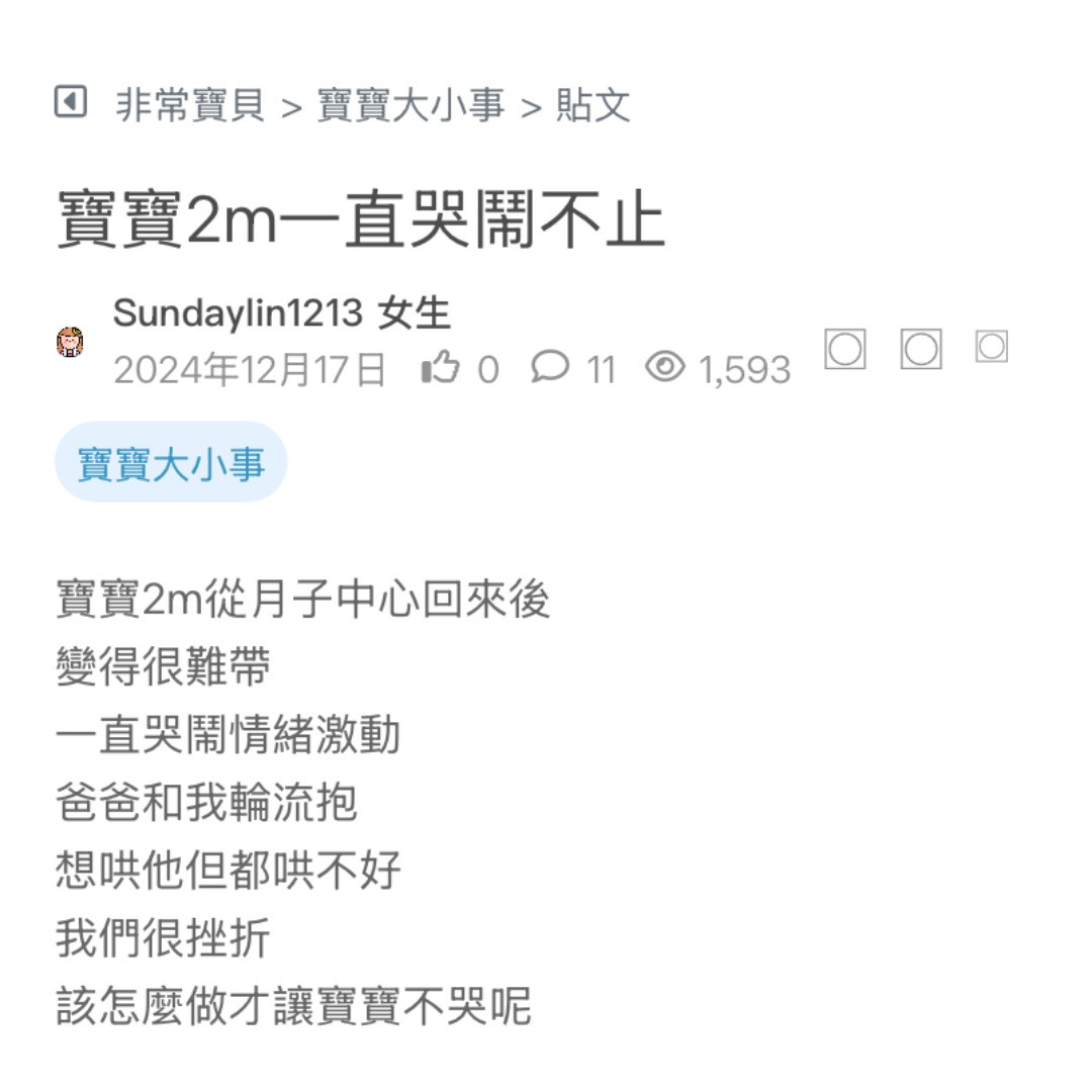 新手媽媽第一次發文~ 加入非常寶貝已經一陣子了 原本以為只有我家寶寶愛哭 後來看到大家的寶寶也很愛哭 原來不是只有我的寶寶這樣 不知道寶寶會哭到幾歲 目前寶...