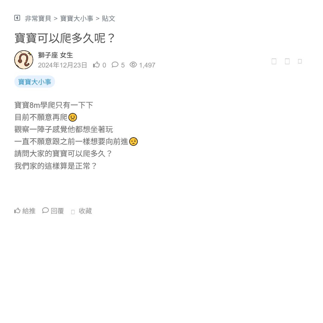 我家寶寶現在7個月 還沒開始爬,是不是該擔心呢? 他現在都只會坐著、趴著 動作超不靈活 其他媽媽的寶寶什麼時候爬的阿 看更多