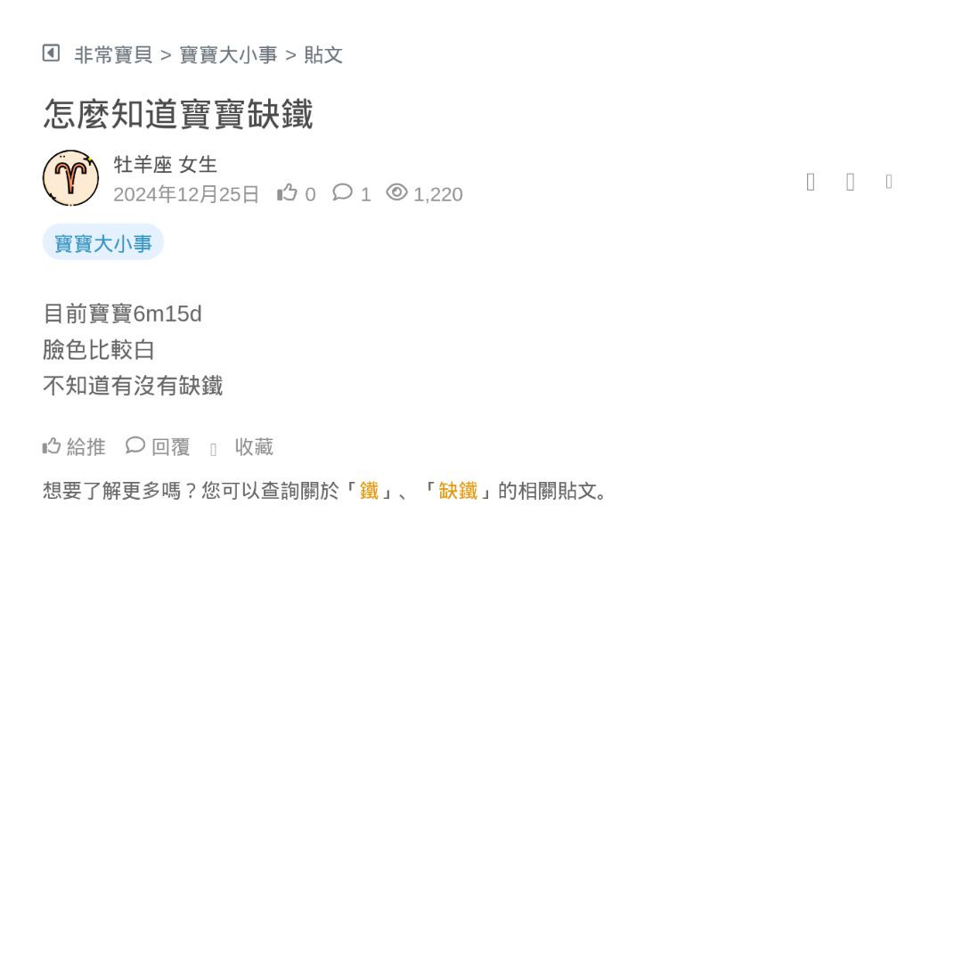 大家好 最近我家寶寶剛滿6個月開始吃副食品 朋友提醒我說要注意鐵的攝取 還說6個月後母乳裡的鐵含量不足 寶寶容易缺鐵 我查了一下資料 好像有說1歲以下的寶寶缺鐵可能會影響發育 還有可能導致貧血 聽起來有點可怕 但也有一些人說其實不需要那麼緊張 母乳或奶粉已經夠了 目前我家寶寶吃母乳為主 奶量應該算夠 不知道需不需... 看更多