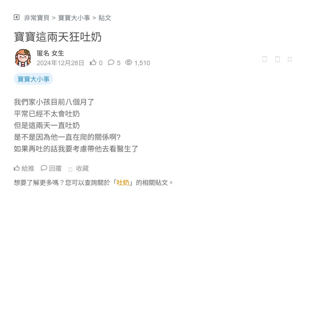 我寶寶也還會吐,6個月以前就超常吐奶🤮的,現在會爬了以後吐更多……要一直清理🧹媽媽真痛苦😖