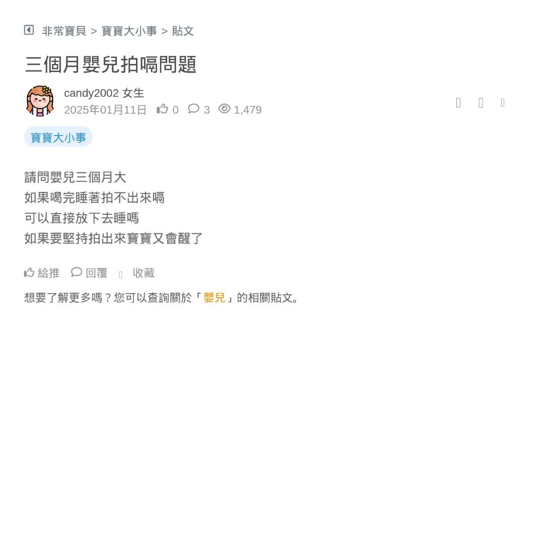 目前小包子2個月大了 請問大家 如果幫寶寶拍嗝 要持續到多大才不用拍嗝呢? 看更多