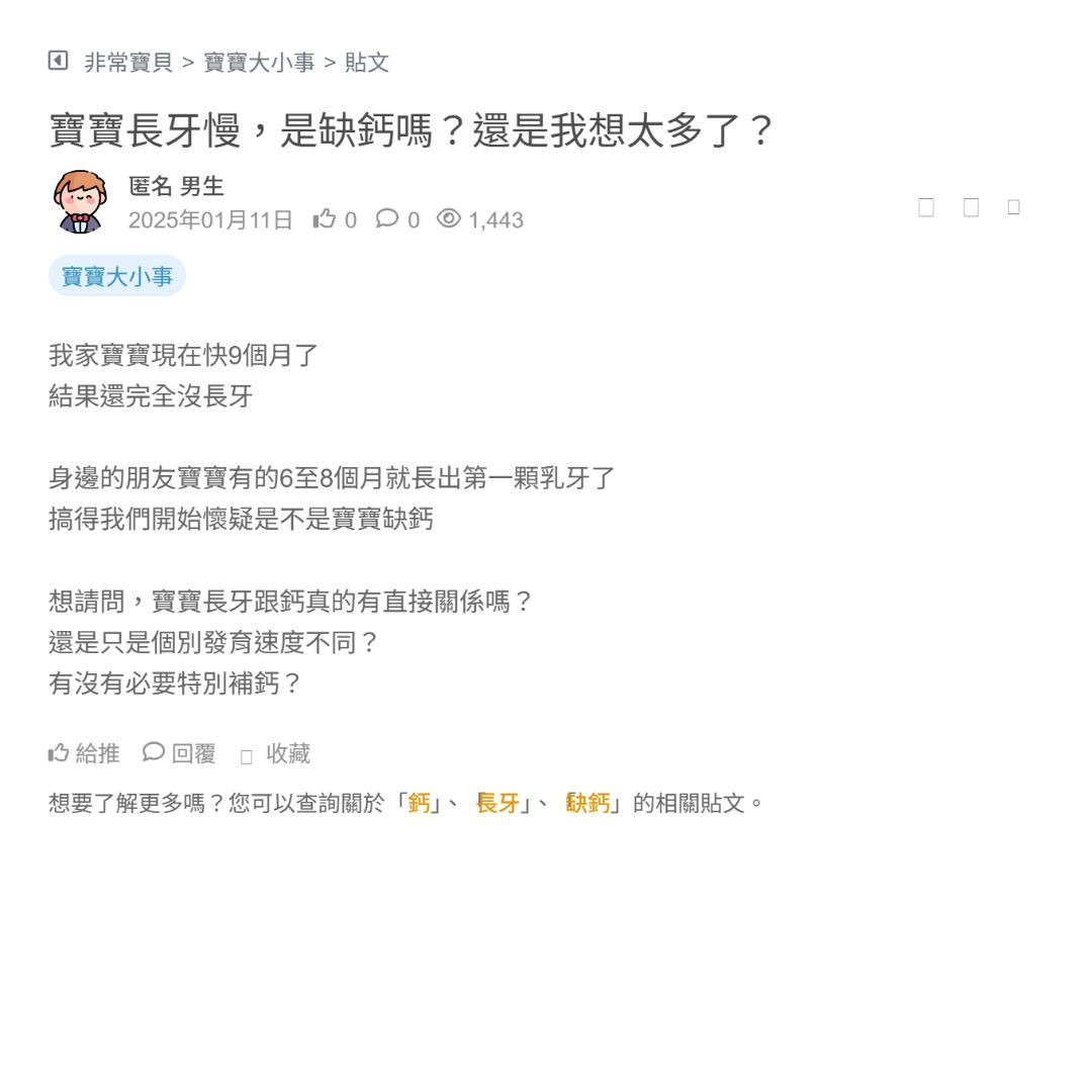 最近在幫7個月大的寶寶做副食品 也開始注意營養品這塊 因為我家寶寶身高體重是後段班,發展比別人晚,加上牙齒還沒長多少顆,我婆婆就一直叫我去買鈣粉、滴劑來補! 但我認識的公園太太跟我說「小孩亂補鈣可能會洗腎、對腎負擔大」 聽到一開始是懷疑的(我跟他不熟)後來上網查看其他人說的,才發現原來一堆媽媽都在滴、... 看更多