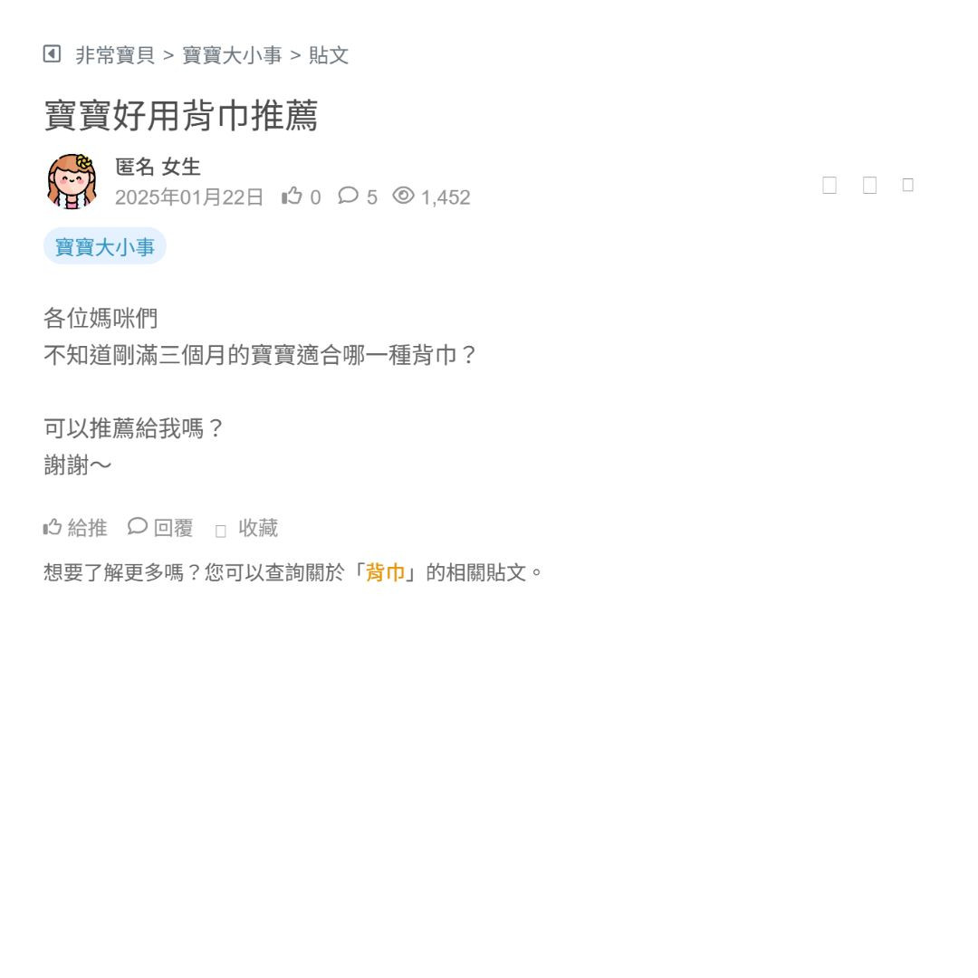 預產期是今年3月 想問~寶寶的揹帶什麼時候買比較好? 看更多
