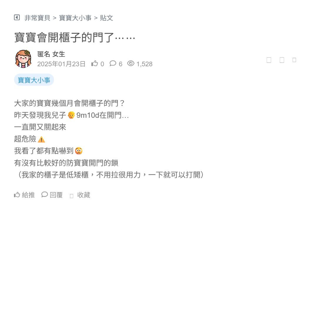 目前小孩1歲了 打算不買安全扣 如果小孩長到3歲還是很容易夾手手嗎 還是3歲小孩就會懂得避開了? 看更多