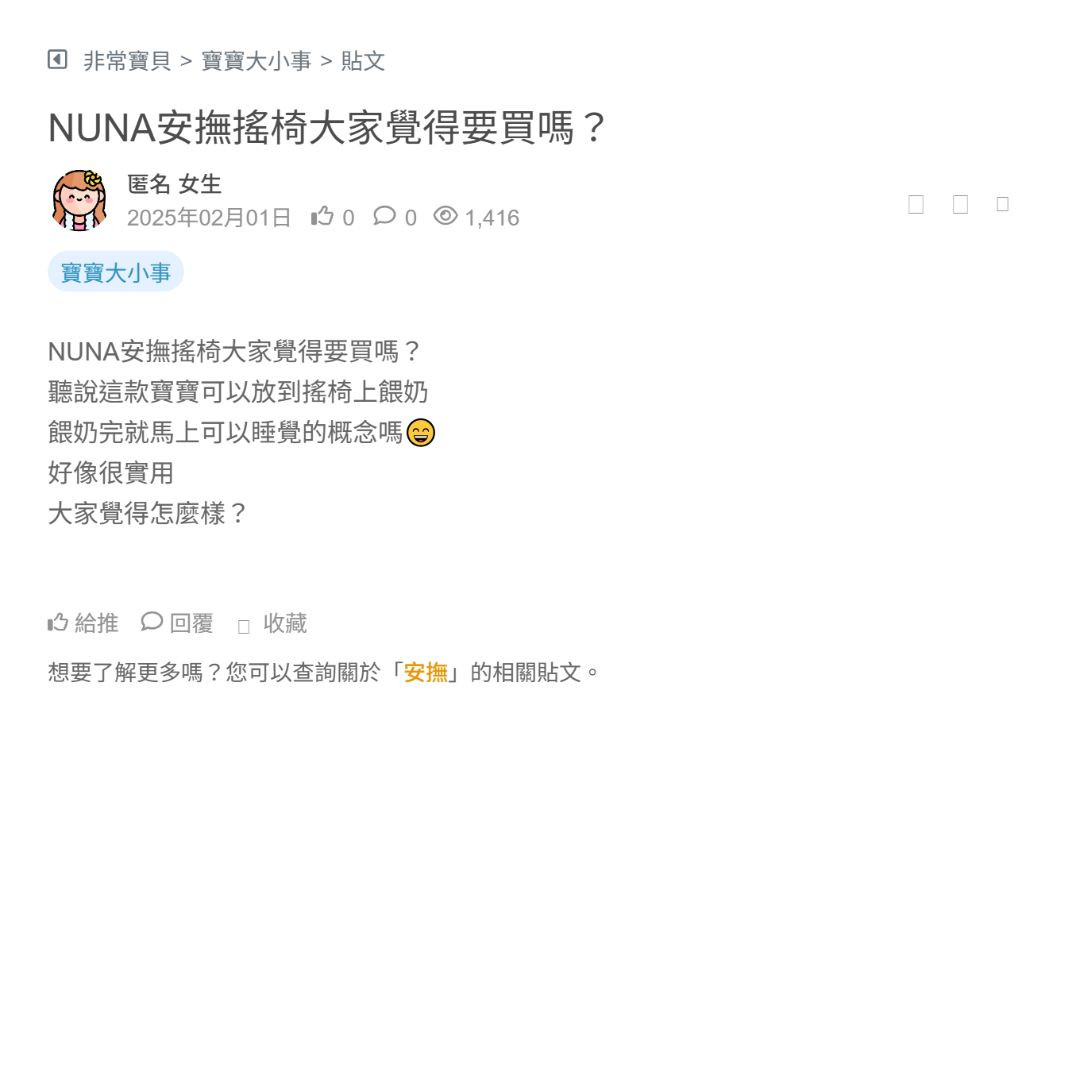 有媽媽在問怎麼解決一直需要抱著寶寶的這個狀況 他說除了晚上睡覺 白天用安撫椅 搖床都沒有用 大人需要一直抱著抱一整天 我看了影片確實寶寶是坐在安撫椅上完全沒被安撫到..寶寶還是一直哭…很大聲很大聲 我寶寶最近也是一直哭 原本想買安撫椅或搖床試試看 看到影片現在反而不敢買… 一個安撫椅費用不便宜... 看更多