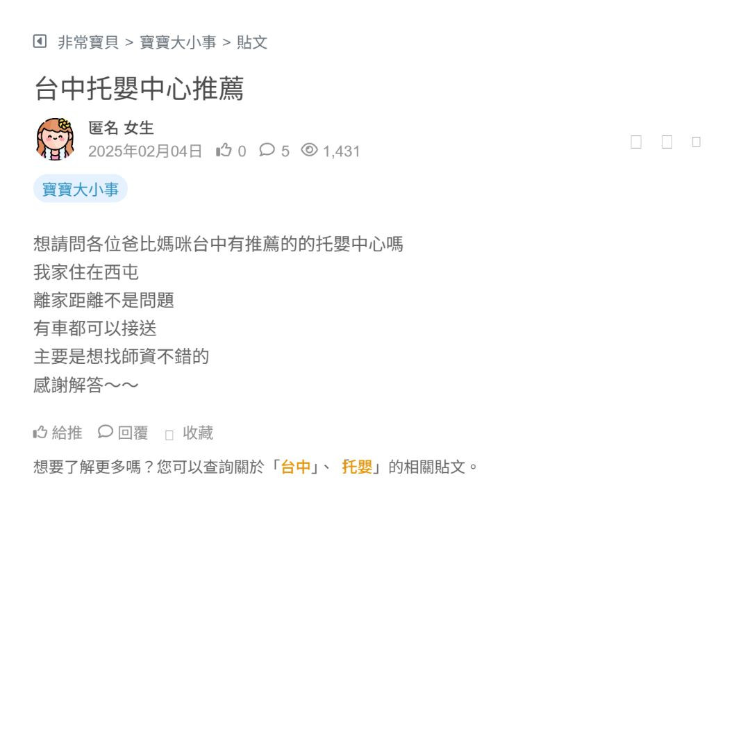 分享之前挑托嬰的重點: 師資穩定、證照、照顧比例與替補人力 環境乾淨、玩具消毒、監視器與安全 作息:飯、活動、睡能配合嗎 換尿布頻率、會不會幫餵副餐? 價格與合約透明嗎?有無額外費用 看更多