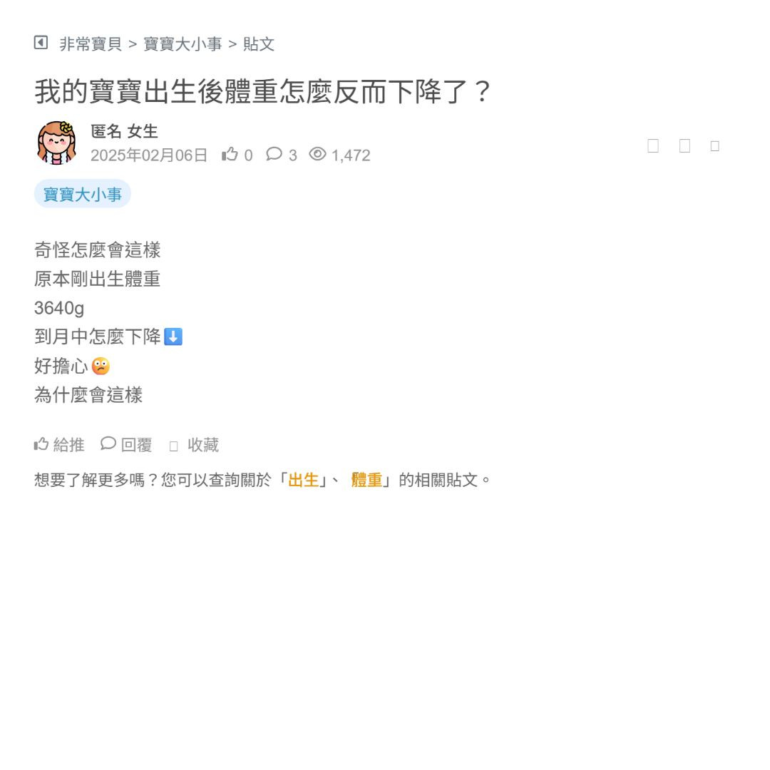 滑到一個媽媽她分享她的寶寶出生是4414g 我從來沒看過這個數字 我自己的寶寶只有2700g生產當天就快受不了(我是自然產) 這位媽媽好偉大 不知道怎麼生下來的...