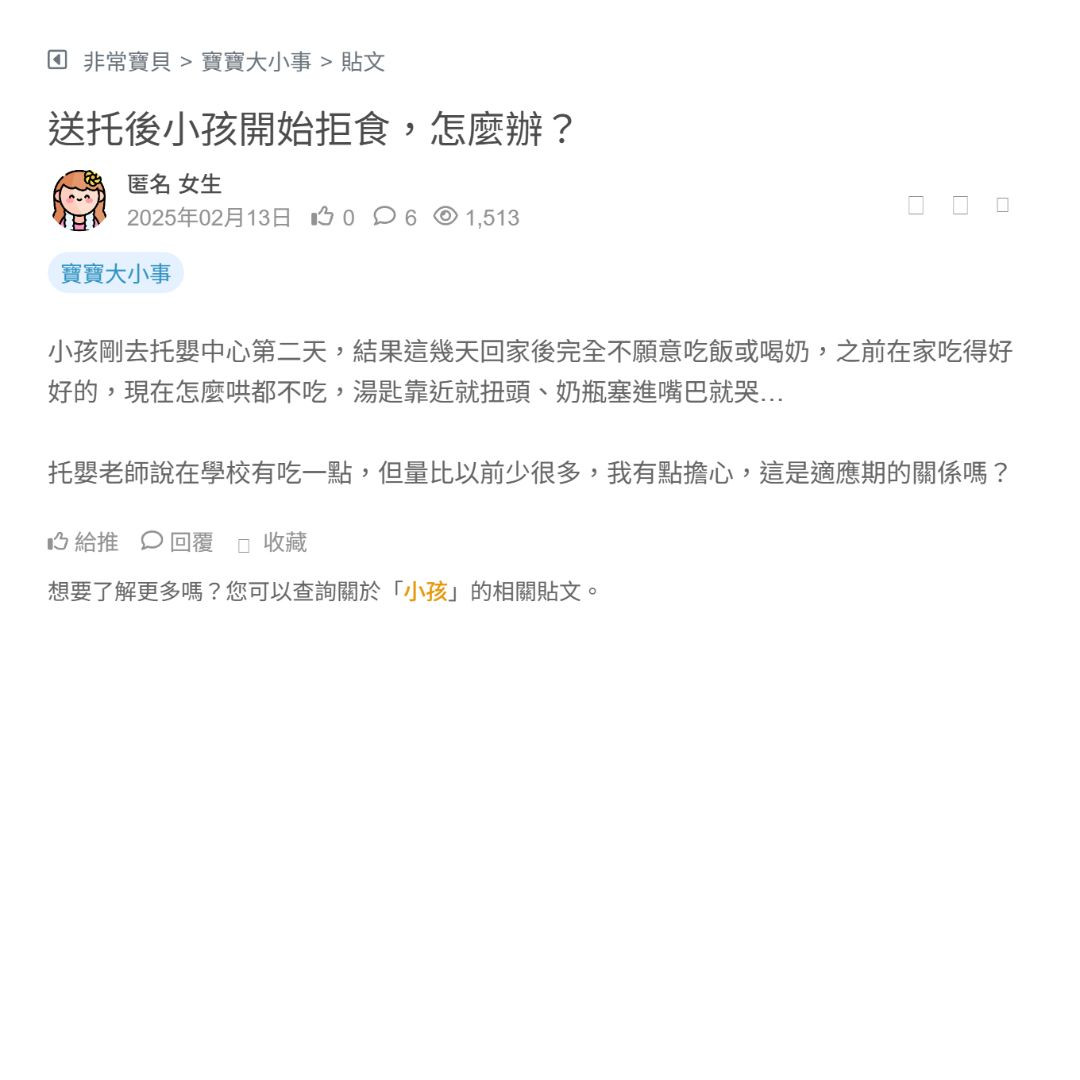 小孩剛去托嬰中心第二天,結果這幾天回家後完全不願意吃飯或喝奶,之前在家吃得好好的,現在怎麼哄都不吃,湯匙靠近就扭頭、奶瓶塞進嘴巴就哭…
