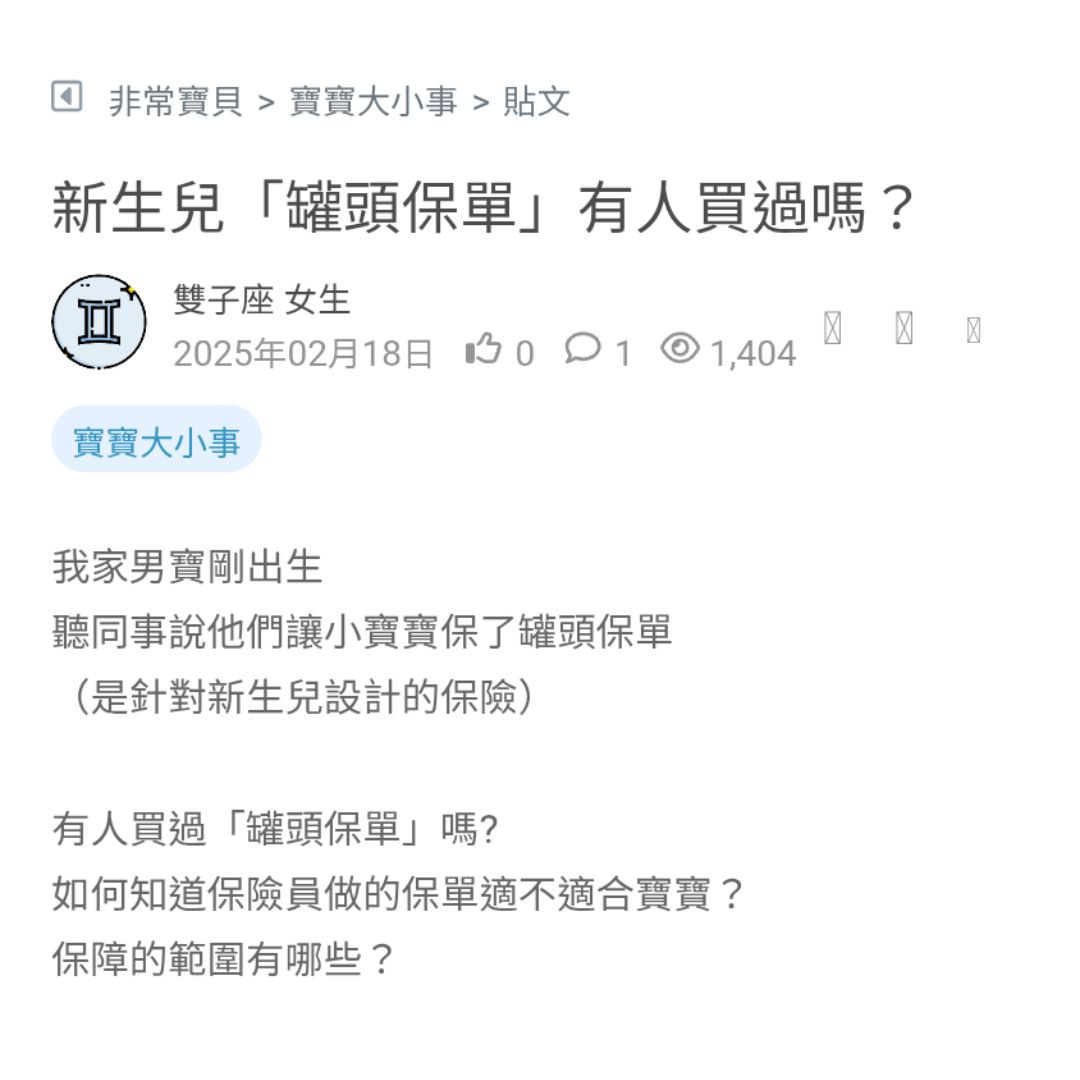 請問剛出生的寶寶可以保險嗎? 有沒有推薦給寶寶的保險員 我沒有認識比較熟做寶寶保險的業務 感謝🙏 看更多
