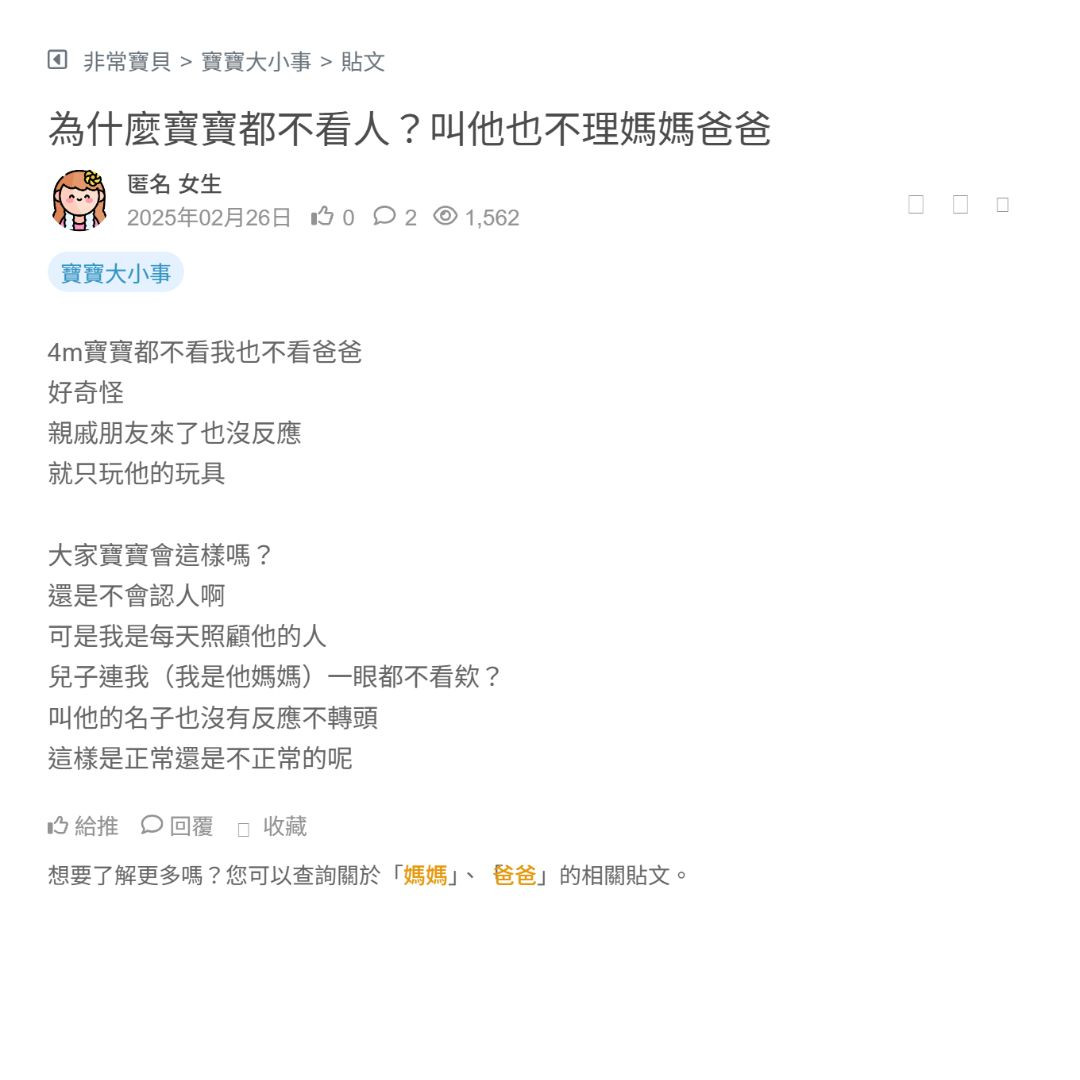 寶寶8m20d了 平常會亂叫 但還不會叫爸爸或媽媽 聽到大人的聲音會轉過頭來看 但是不會說單字 上個禮拜帶她去看醫生 醫生說是正常的 有一點擔心怎麼辦... 看更多