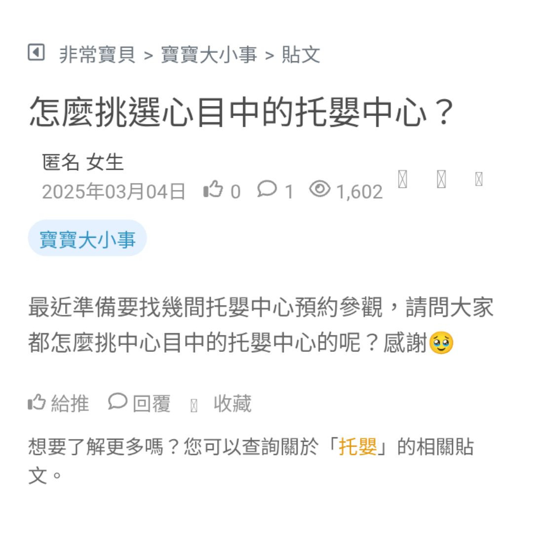 分享之前挑托嬰的重點: 師資穩定、證照、照顧比例與替補人力 環境乾淨、玩具消毒、監視器與安全 作息:飯、活動、睡能配合嗎 換尿布頻率、會不會幫餵副餐? 價格與合約透明嗎?有無額外費用 看更多