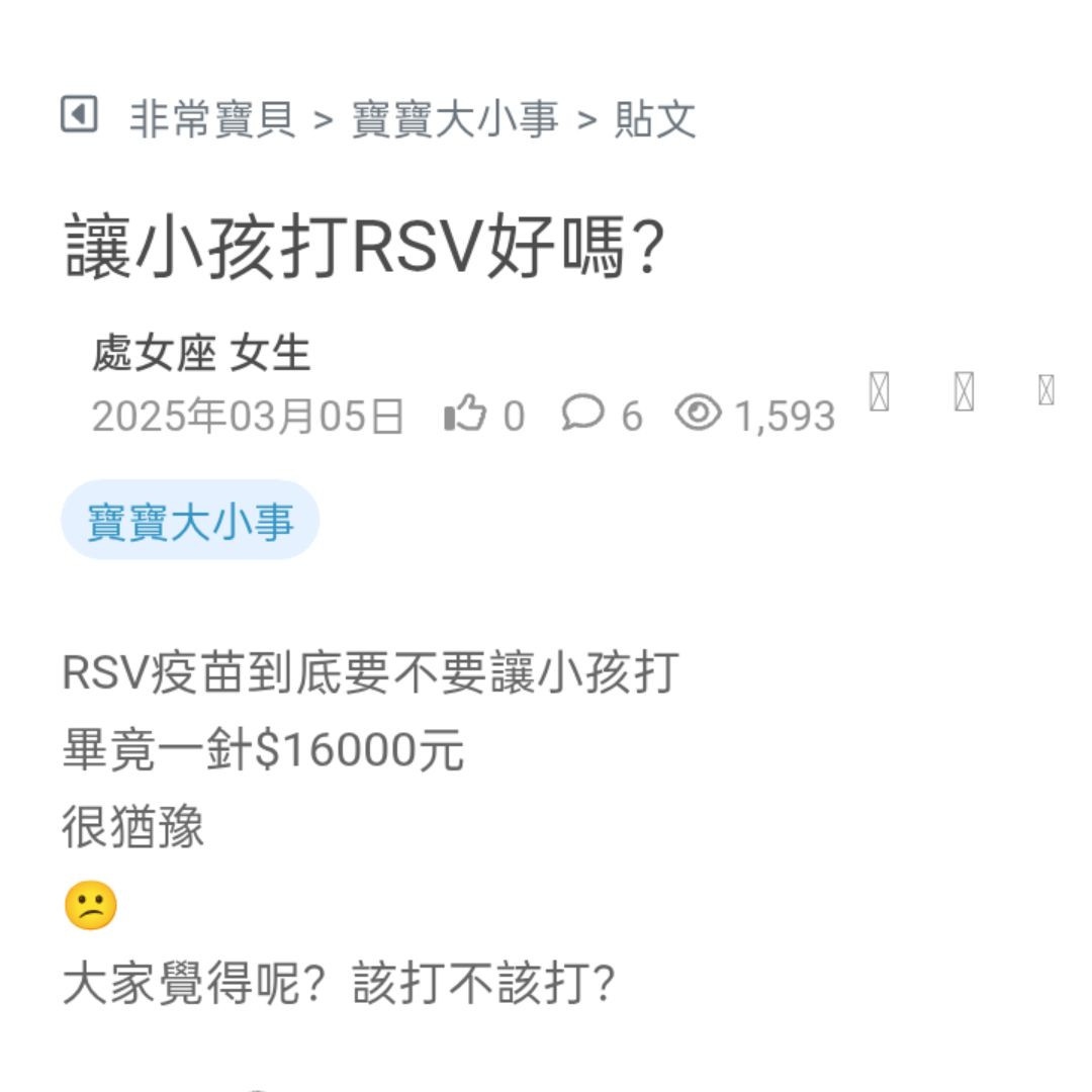 有人給小孩打過RSV疫苗的嗎,現在行情ㄧ針RSV疫苗價格多少錢?會很貴嗎 看更多
