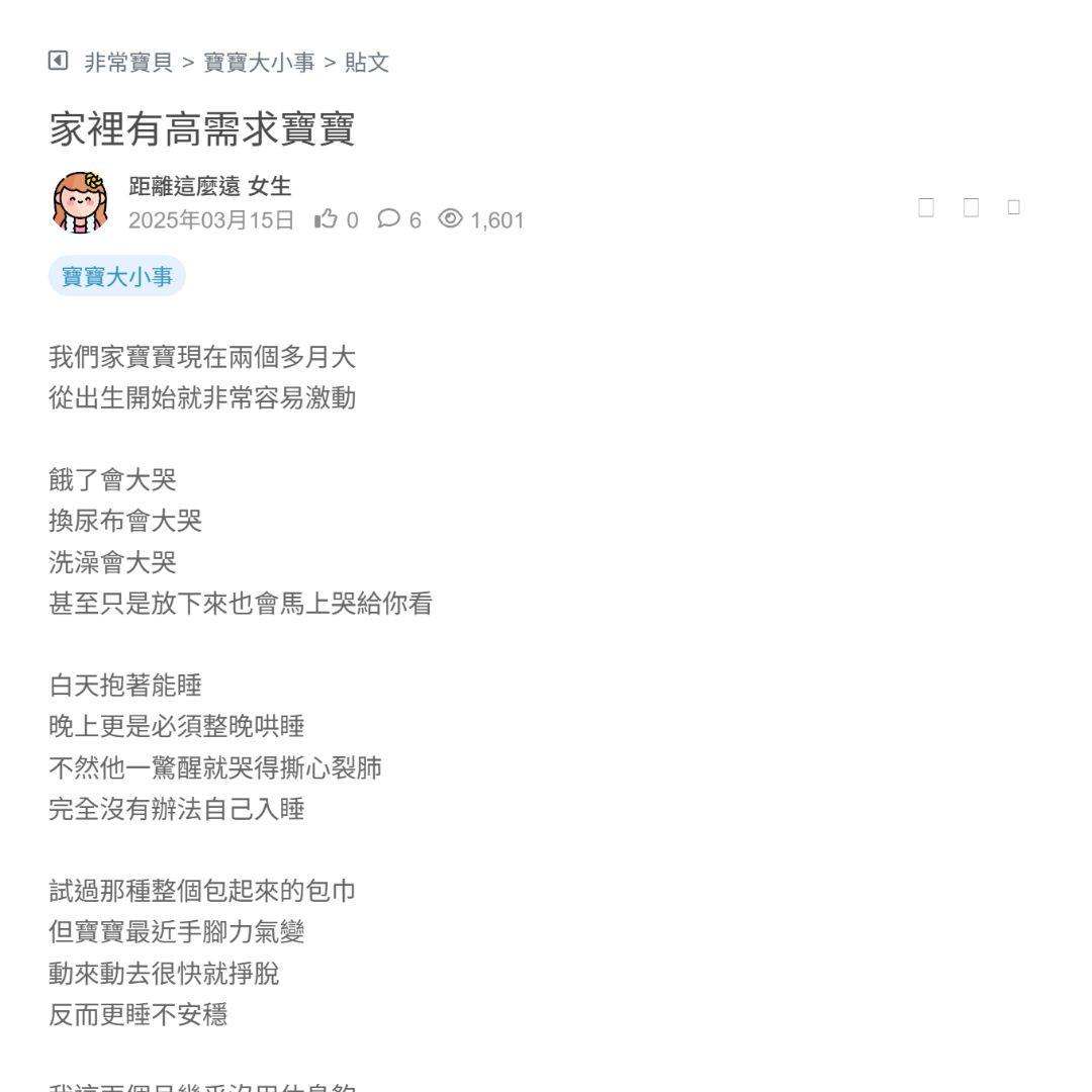 拜託各位媽咪!有沒有人家裡也有一隻2個月大的小魔王? 我家這位公主超.難.哄!!! 不誇張 從早上開始就在鬧 到晚上都還在「啊啊哇哇哇」無限循環 抱了,不行 奶喝了,也不行 換尿布,乾爽到不行,但還是不行 哄睡、搖、拍、唱歌、開白噪音,全都試過,還是一直哭 明明在月中之前好像還滿好睡的 現在是怎... 看更多