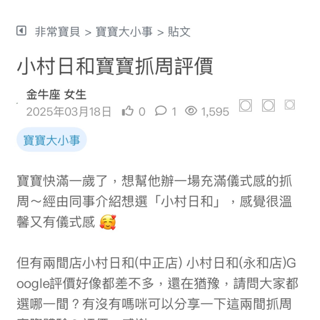 但有兩間店小村日和(中正店) 小村日和(永和店)Google評價好像都差不多,還在猶豫,請問大家都選哪一間?有沒有嗎咪可以分享一下這兩間抓周實際體驗&評價~感謝