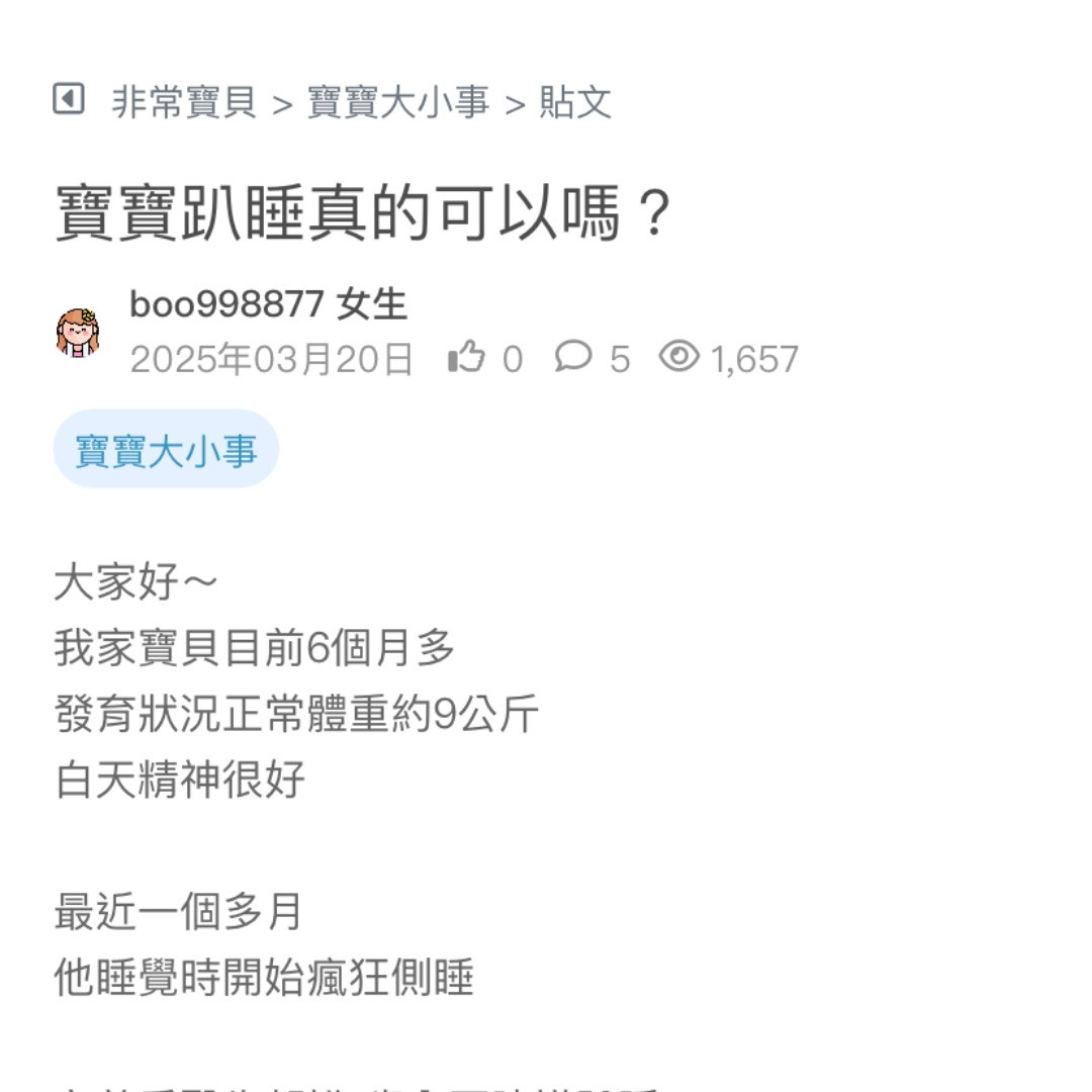 各位媽咪爸比,我最近有件放在心中很久的事情,希望說出來給大家聽聽 寶寶剛出生的時候,我去月中住21天休養,護理師在照顧的時候,把我孩子轉成趴睡?!...