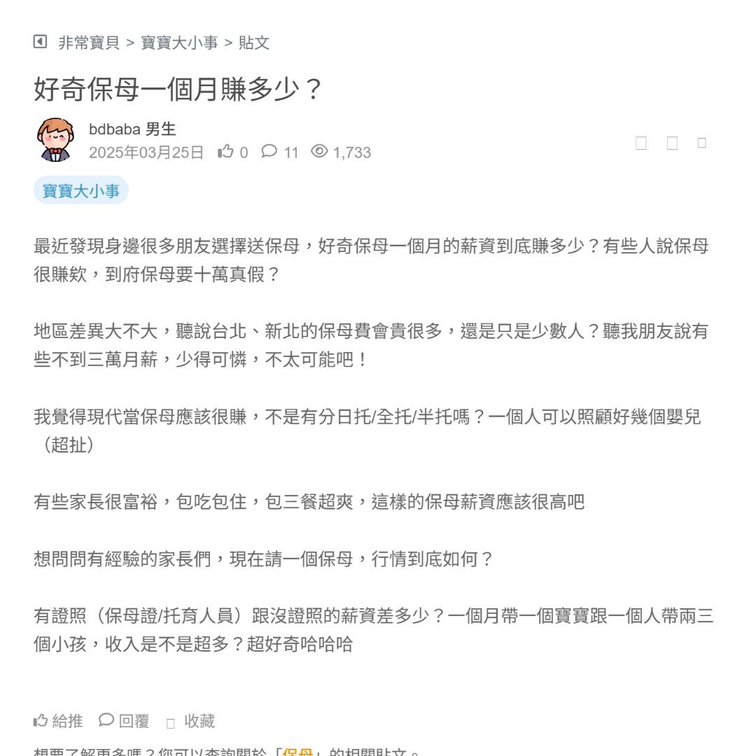 最近發現身邊很多朋友選擇送保母,好奇保母一個月的薪資到底賺多少?有些人說保母很賺欸,到府保母要十萬真假?