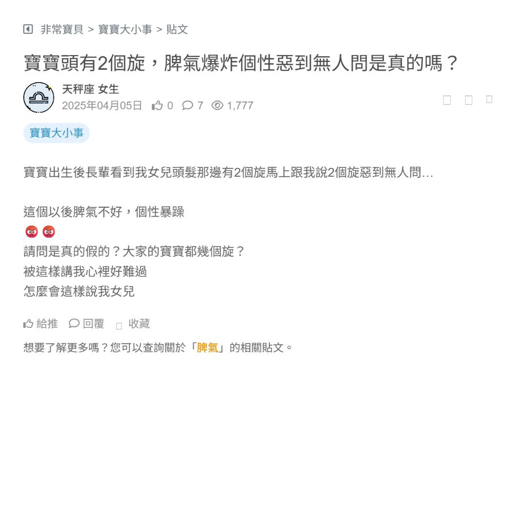 寶寶出生後長輩看到我女兒頭髮那邊有2個旋馬上跟我說2個旋惡到無人問…