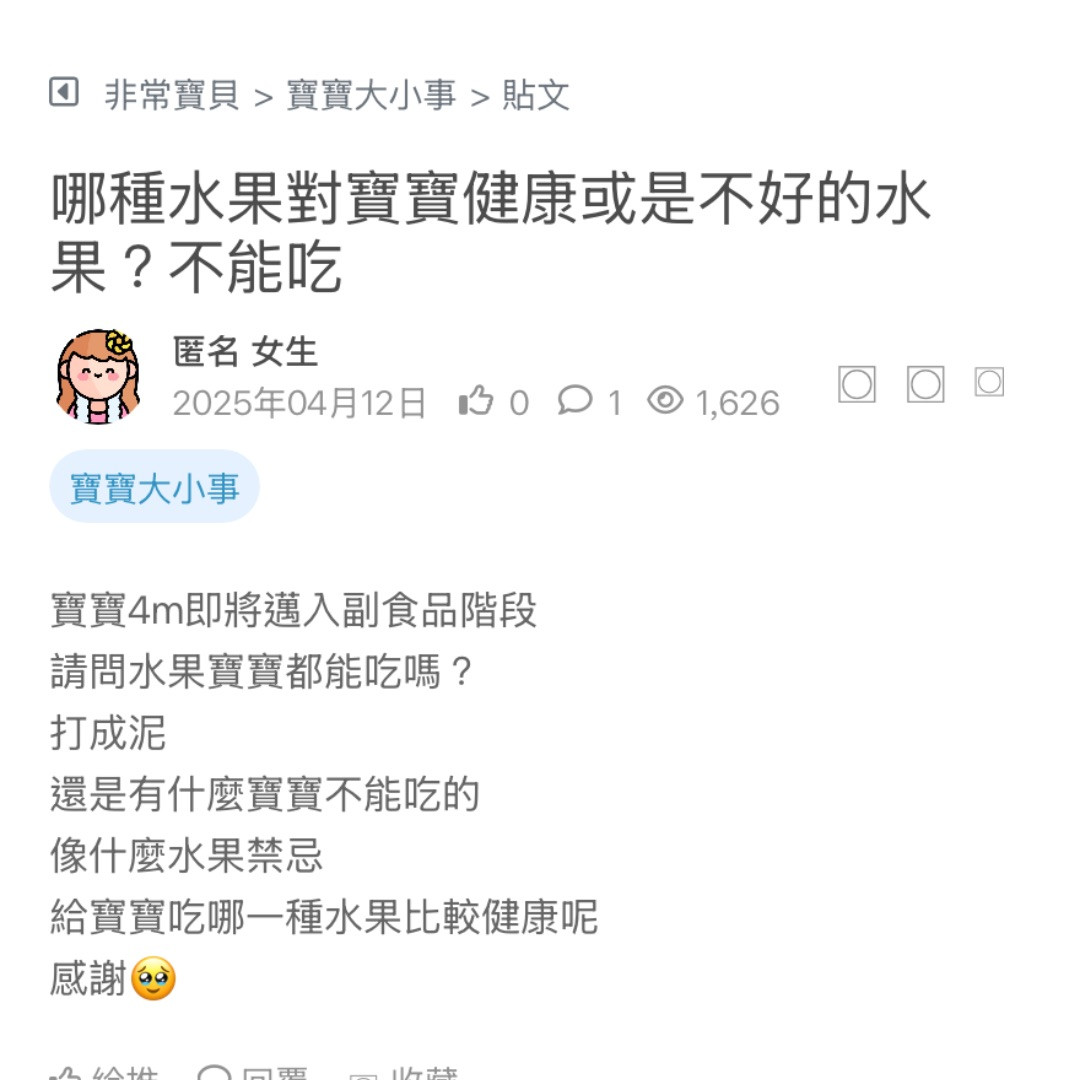 請問4m大副食品可以吃什麼? 目前想到的是自己打水果擬 農純鄉好像只賣5m以上的 看更多