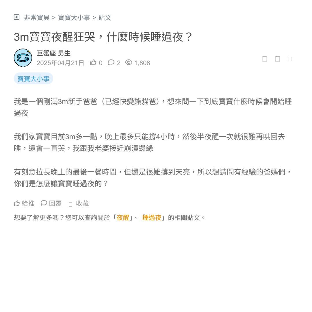 我們家寶寶目前3m多一點,晚上最多只能撐4小時,然後半夜醒一次就很難再哄回去睡,還會一直哭,我跟我老婆接近崩潰邊緣