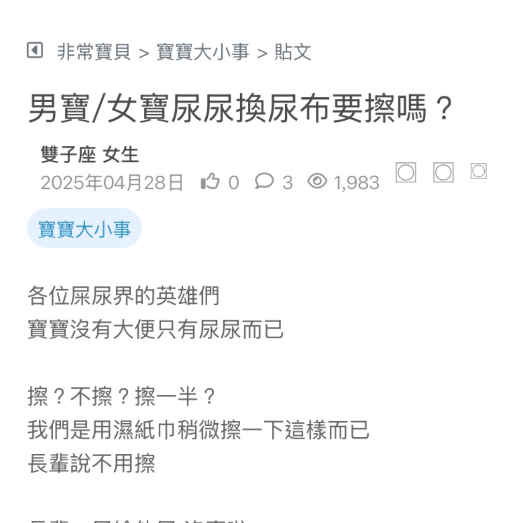 拜託擦一下!男寶女寶都一樣!不管有沒有便便,至少用濕紙巾輕輕擦一下比較好,尿尿也會有殘留啦