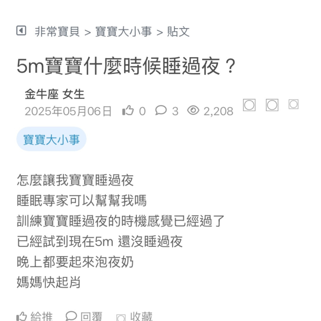 我是一個剛滿3m新手爸爸(已經快變熊貓爸),想來問一下到底寶寶什麼時候會開始睡過夜 我們家寶寶目前3m多一點,晚上最多只能撐4小時,然後半夜醒一次就很難...