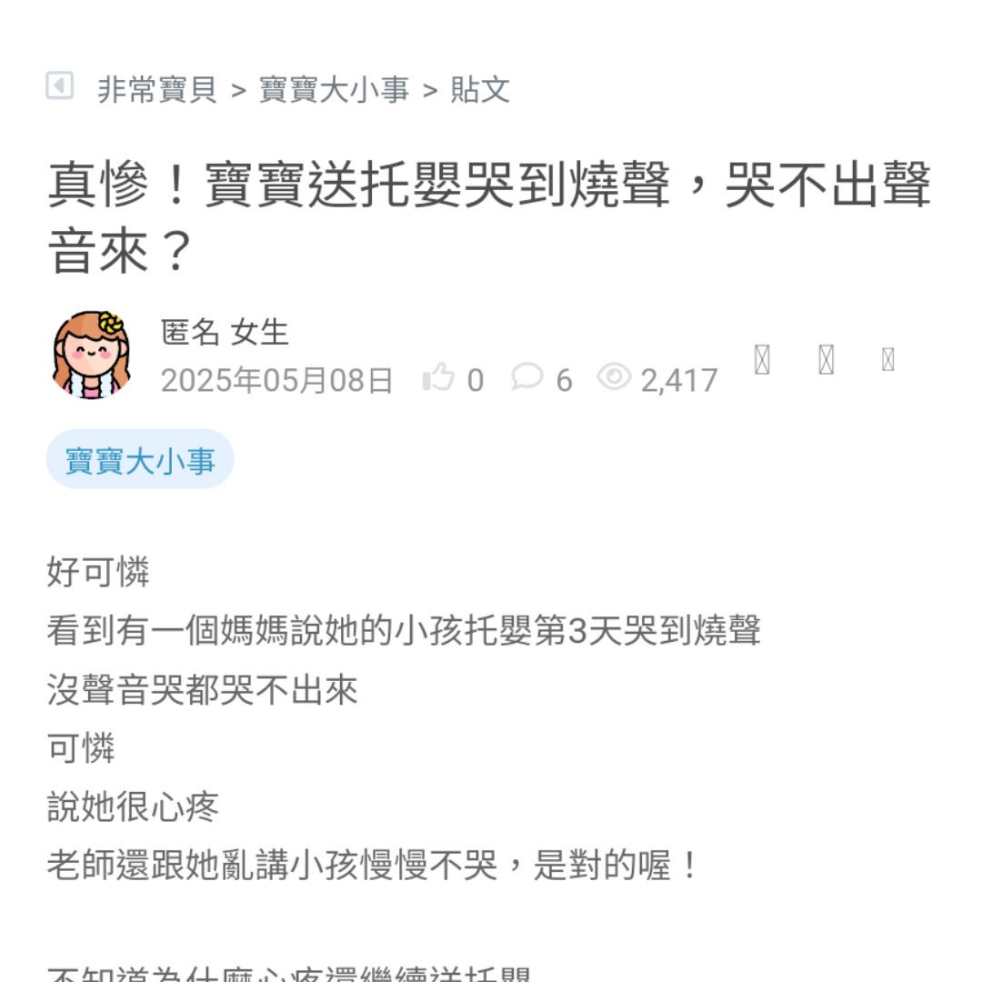 看到有一個媽媽說她的小孩托嬰第3天哭到燒聲