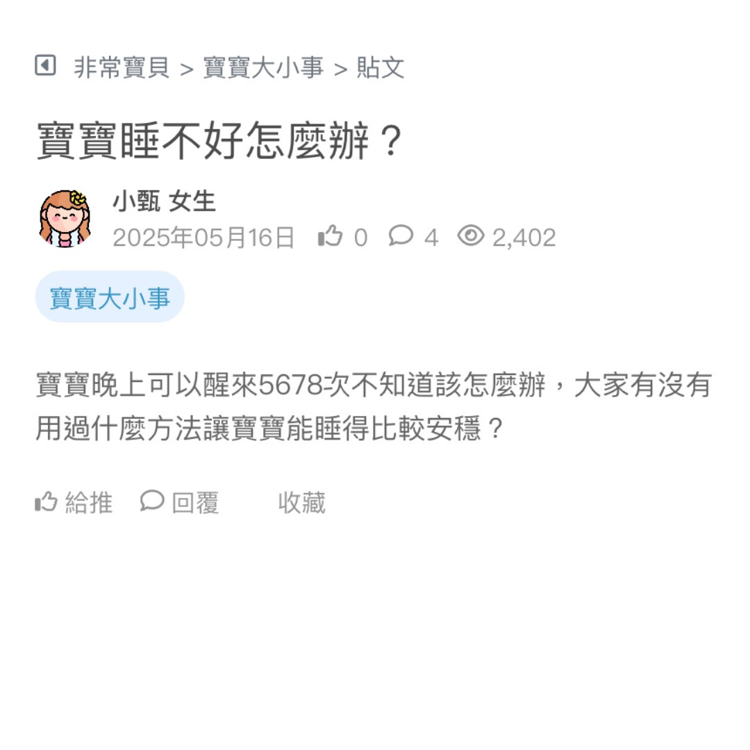 最近我家寶寶晚上超難哄睡,哭鬧到半夜都沒停過😭,有沒有媽咪爸爸也遇過這種狀況?試過唱歌、講故事還是沒用,超崩潰欸!大家有什麼哄睡技巧嗎?拜託分享一下🙏...