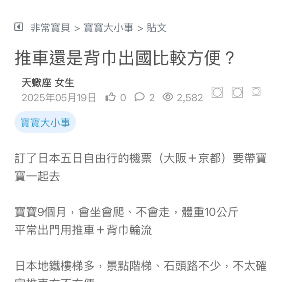 目前老公是說考慮帶推車,可是很多地方可能不好推,背巾怕太重,背久會累、寶寶睡不熟,登機型小推車,折疊快不確定實用性