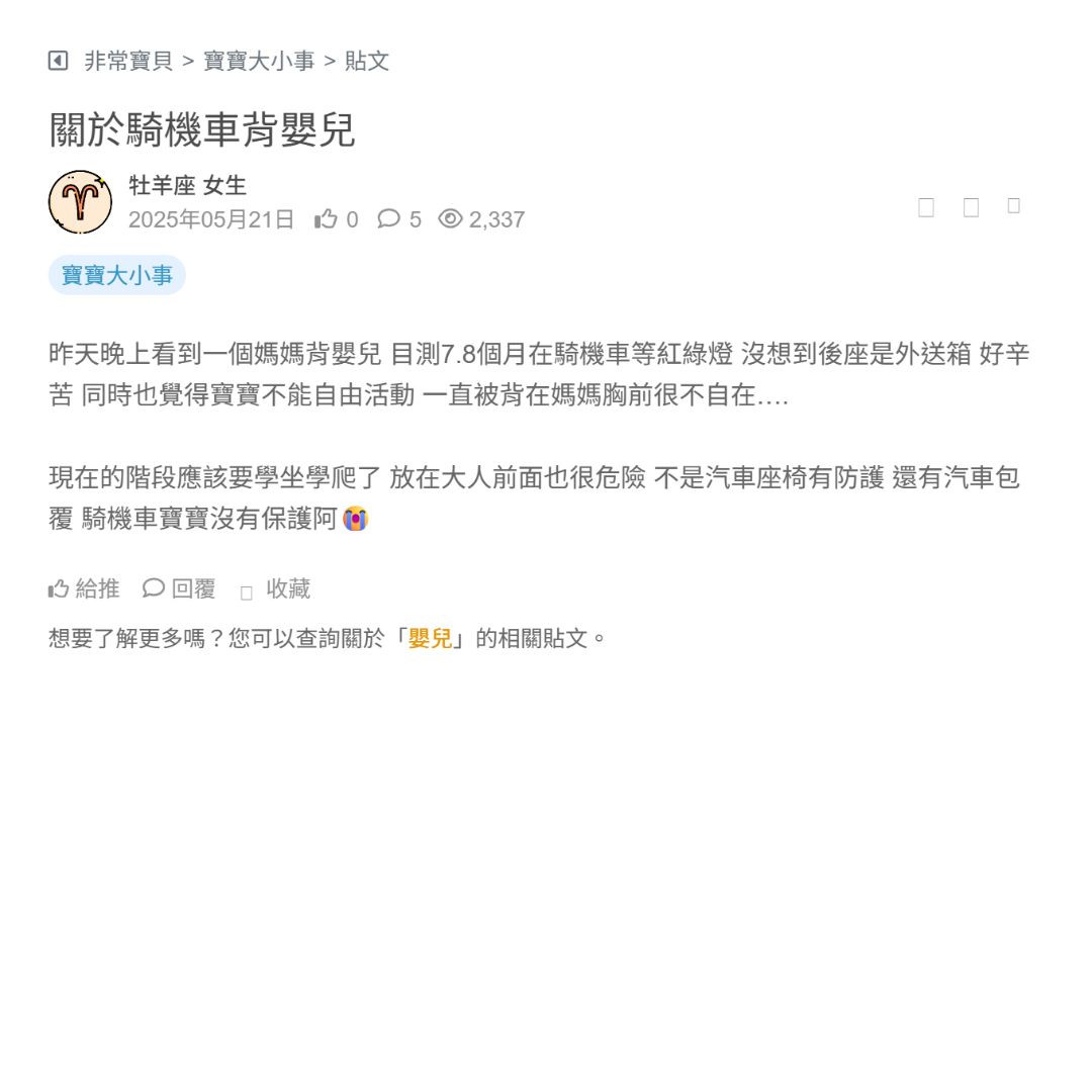 現在的階段應該要學坐學爬了 放在大人前面也很危險 不是汽車座椅有防護 還有汽車包覆 騎機車寶寶沒有保護阿😭