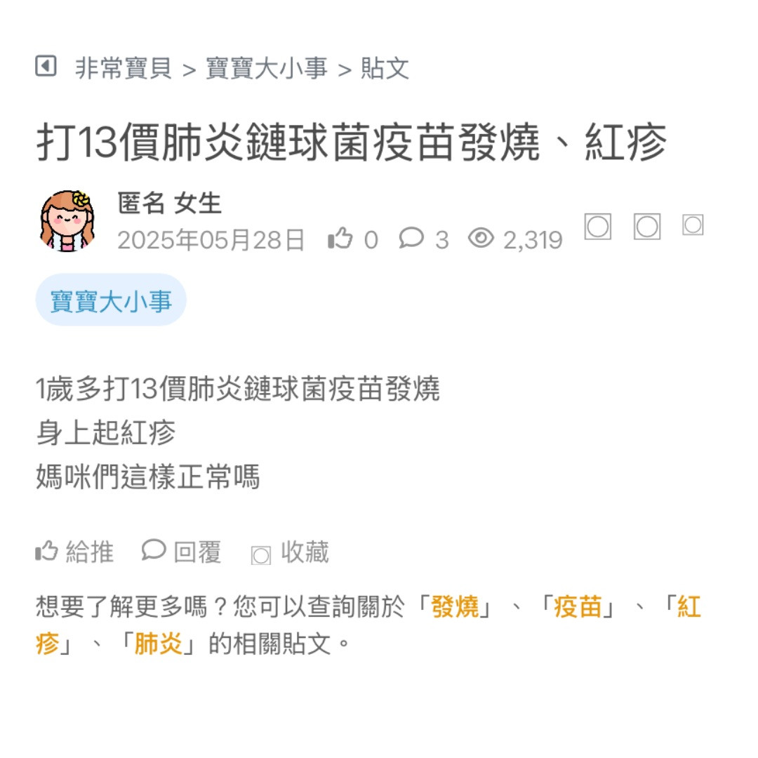 打完13價肺炎鏈球菌疫苗後發燒跟紅疹是比較常見的副作用喔~媽媽別太擔心,寶寶的免疫系統在建立中,通常幾天內會自己退掉