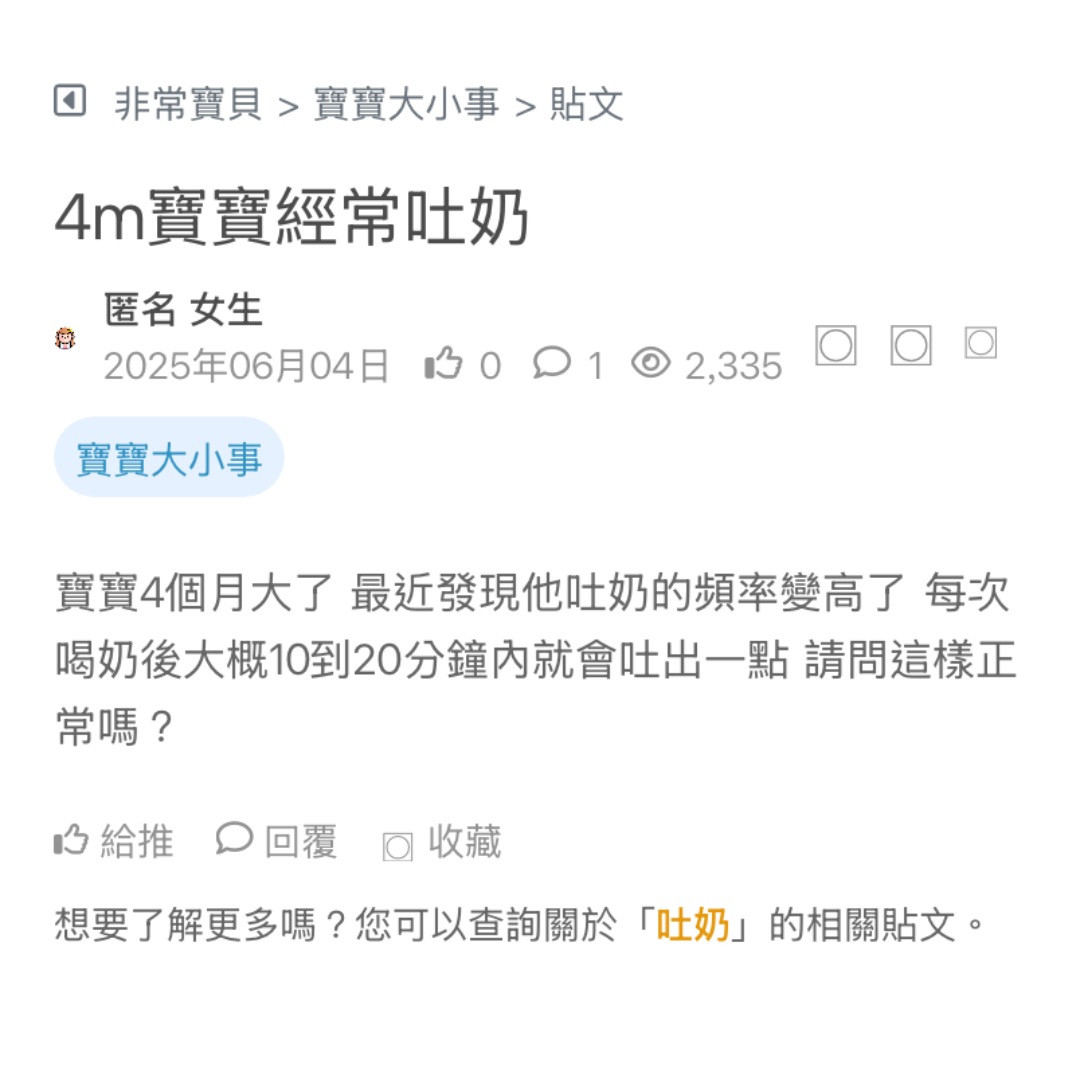 如果吐奶量很大、頻率突然增加,或寶寶有其他不舒服症狀,還是要帶去給小兒科醫生檢查比較安心
