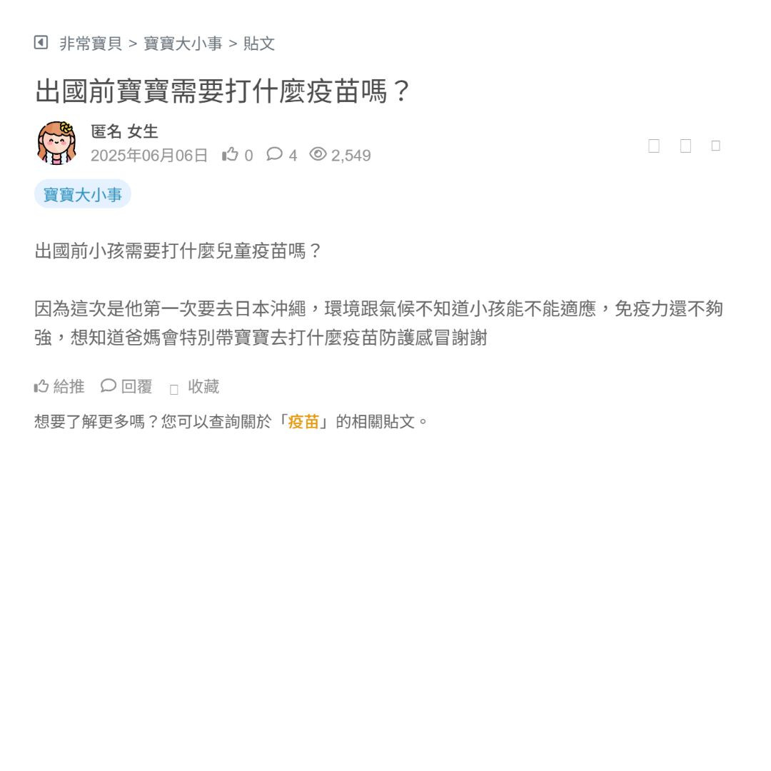 因為這次是他第一次要去日本沖繩,環境跟氣候不知道小孩能不能適應,免疫力還不夠強,想知道爸媽會特別帶寶寶去打什麼疫苗防護感冒謝謝