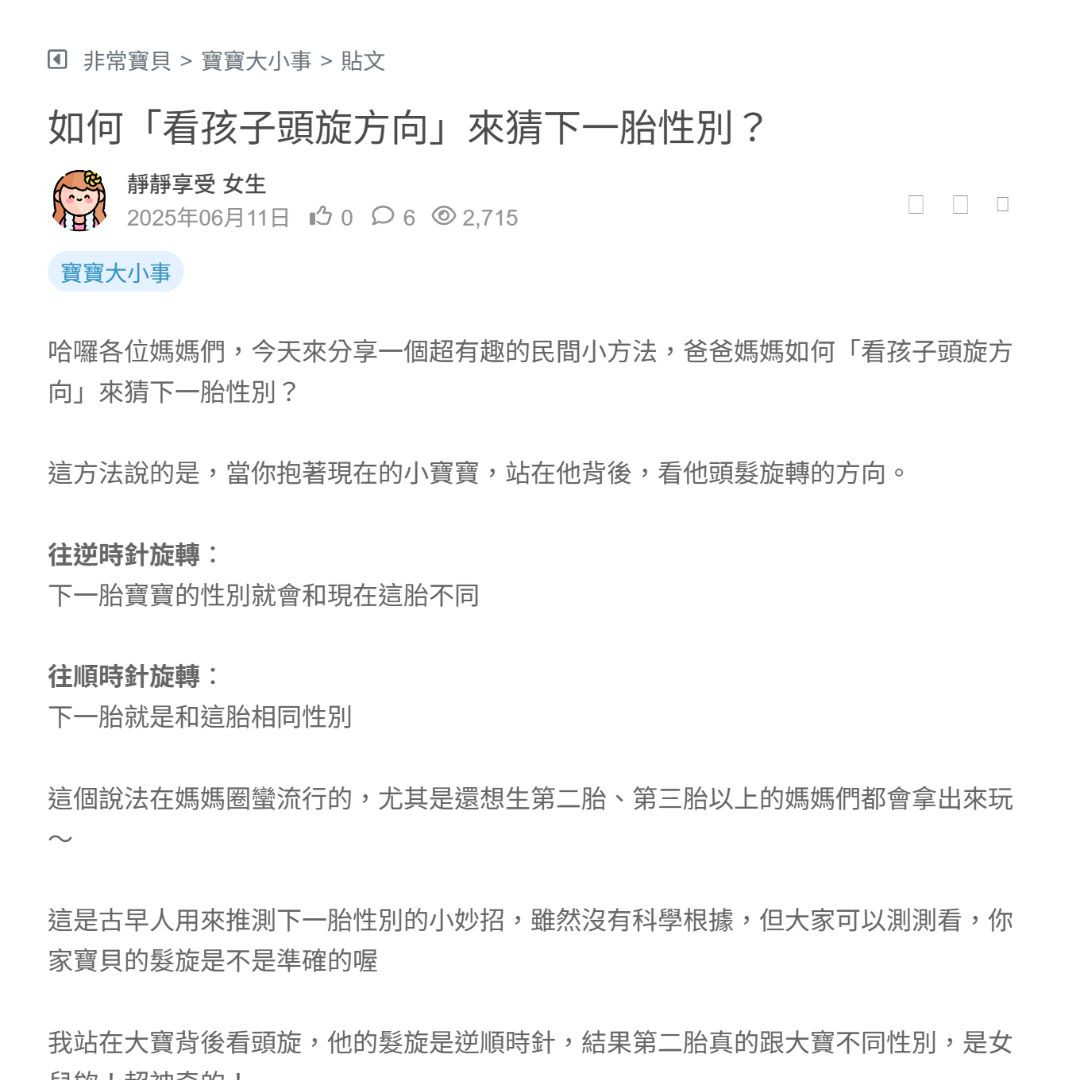 我站在大寶背後看頭旋,他的髮旋是逆順時針,結果第二胎真的跟大寶不同性別,是女兒欸!超神奇的!