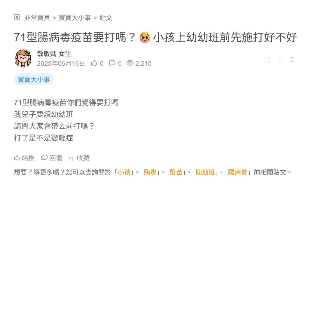 最近新冠疫情又爆發 好擔心寶寶健康 請問各位爸爸媽媽有讓寶寶打新冠疫苗嗎 聽說快篩都買不到 🥹 看更多