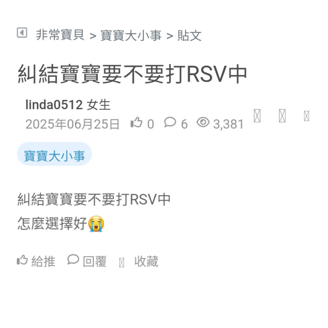 我之前也超猶豫!RSV感冒真的很容易讓小寶寶呼吸道嚴重不舒服,尤其冬天到的時候。建議可以先問問醫生寶寶目前的健康狀況,再評估打疫苗的利弊,畢竟保護力還是有的~加油!