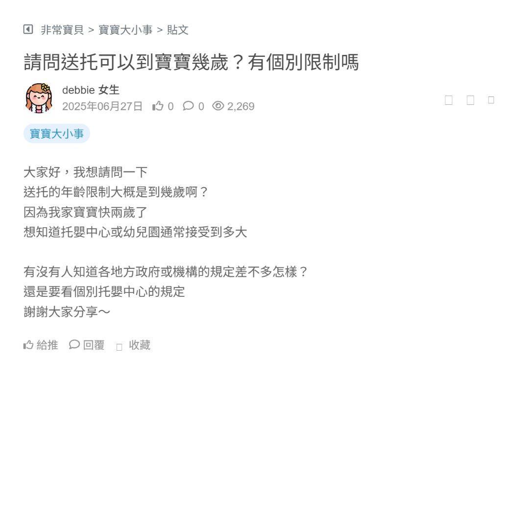 想送托,一個人快堅持不下去了😭😭😭 請問大家都是幾個月送嬰兒到托嬰中心的阿 送過去有限制年齡嗎?先謝謝各位了🙏 看更多