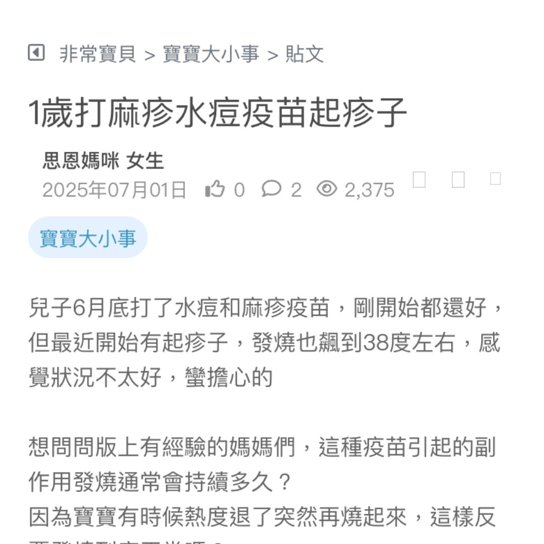 兒子6月底打了水痘和麻疹疫苗,剛開始都還好,但最近開始有起疹子,發燒也飆到38度左右,感覺狀況不太好,蠻擔心的