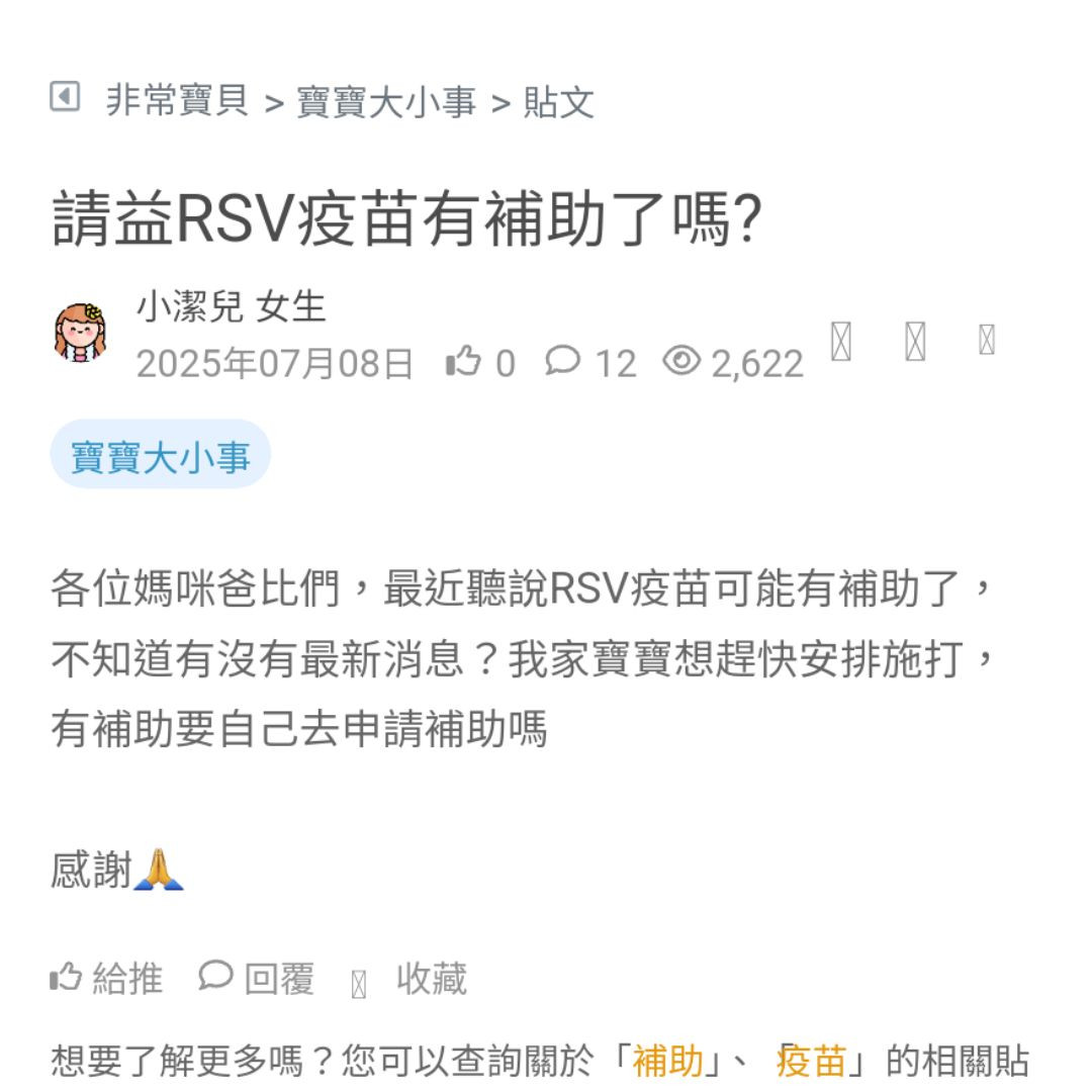 各位媽咪爸比們,最近聽說RSV疫苗可能有補助了,不知道有沒有最新消息?我家寶寶想趕快安排施打,有補助要自己去申請補助嗎