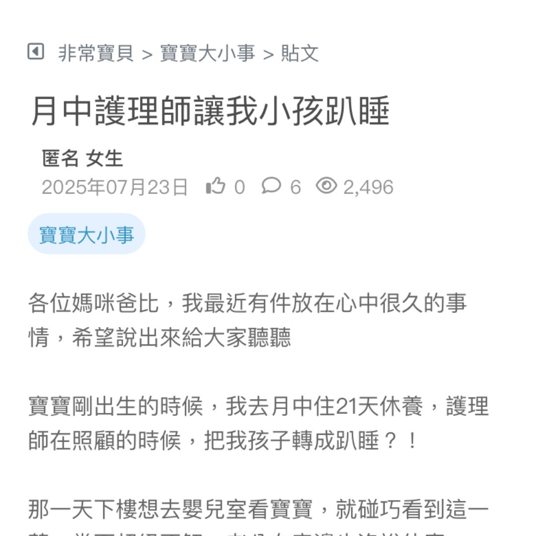 寶寶剛出生的時候,我去月中住21天休養,護理師在照顧的時候,把我孩子轉成趴睡?!
