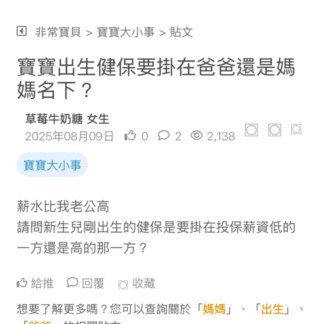 寶寶出生健保要掛在爸爸還是媽媽名下?