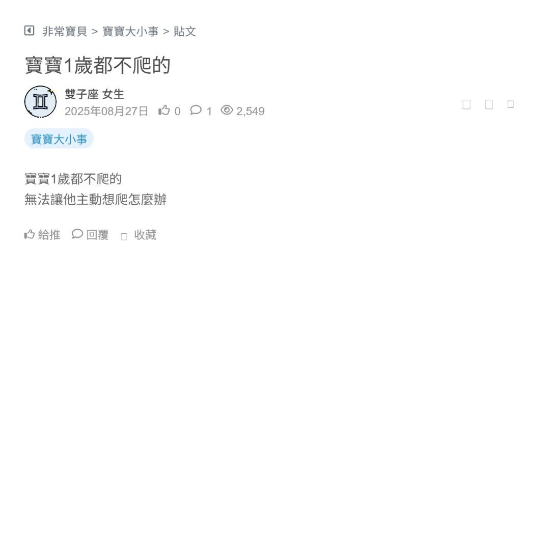 寶寶8m學爬只有一下下 目前不願意再爬😟 觀察一陣子感覺他都想坐著玩 一直不願意跟之前一樣想要向前進🤨 請問大家的寶寶可以爬多久? 我們家的這樣算是正常? 看更多