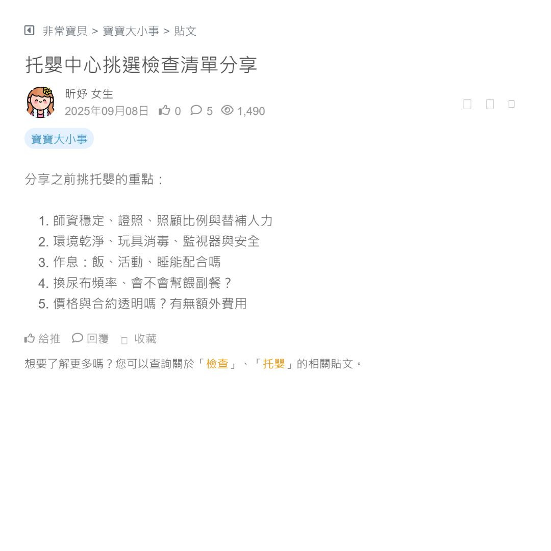 最近準備要找幾間托嬰中心預約參觀,請問大家都怎麼挑中心目中的托嬰中心的呢?感謝🥹 看更多