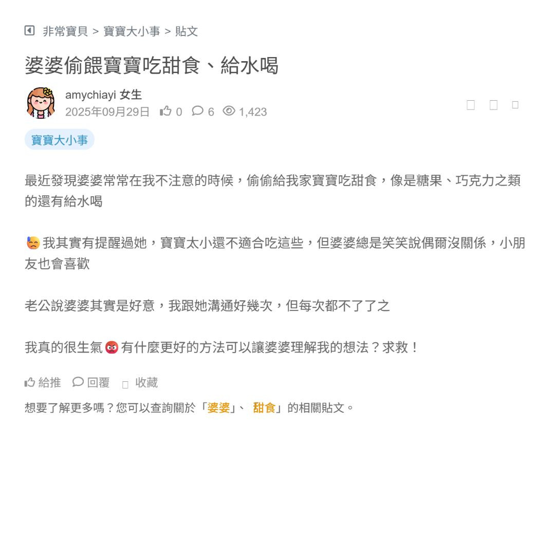 😓我其實有提醒過她,寶寶太小還不適合吃這些,但婆婆總是笑笑說偶爾沒關係,小朋友也會喜歡