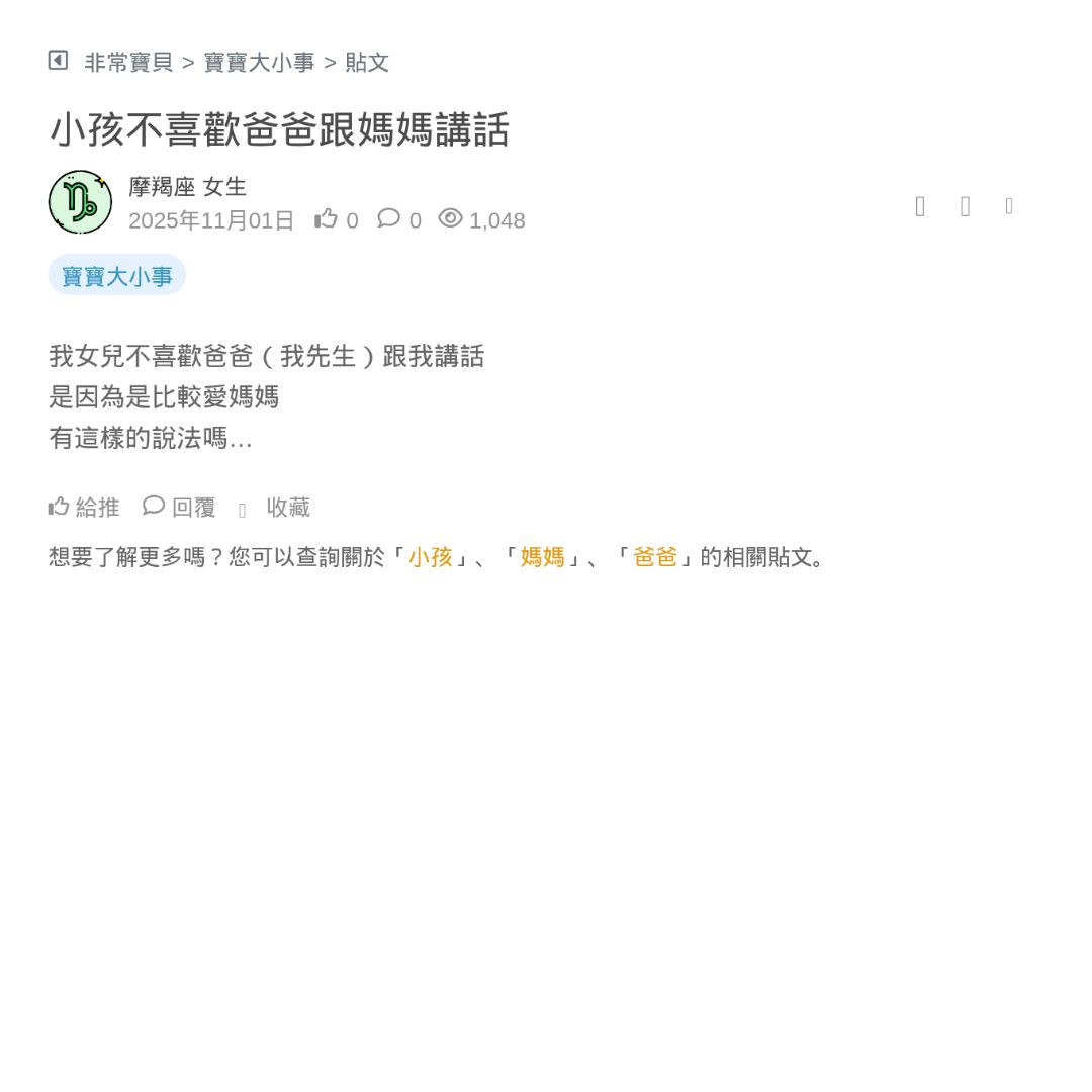 我一直覺得我跟我媽媽的關係還不錯 但最近她對我的女兒有很多意見 我媽會說一些不舒服的話 像是“你怎麼讓她這麼挑食?” “她怎麼那麼不聽話?” “你怎麼不教她規矩?” 每當我媽說這些話,我會覺得很有壓力心情好糟 我知道有時候女兒會調皮 我覺得都是小事情 但是我媽為什麼會一直唸 她的指責都讓我覺得自己不稱職 如果這種情... 看更多