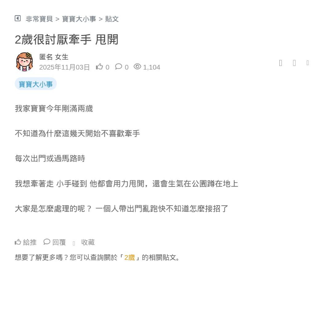 在社群有看到網友分享 他說小孩哭 就直接走掉 因為說他小孩沒多久就會跟上來 但放小孩一個人在路上看起來很危險 我的做法因該會看著他 但看著他之後呢? 1.看著他在地上哭到稍微冷靜,哭到不行再抱 2.看著他在地上哭完再走,絕對不抱 3.直接抱起來—不滿足需求(不給玩具、任何他想,不要讓他認為哭鬧就可以得到想要的東西... 看更多