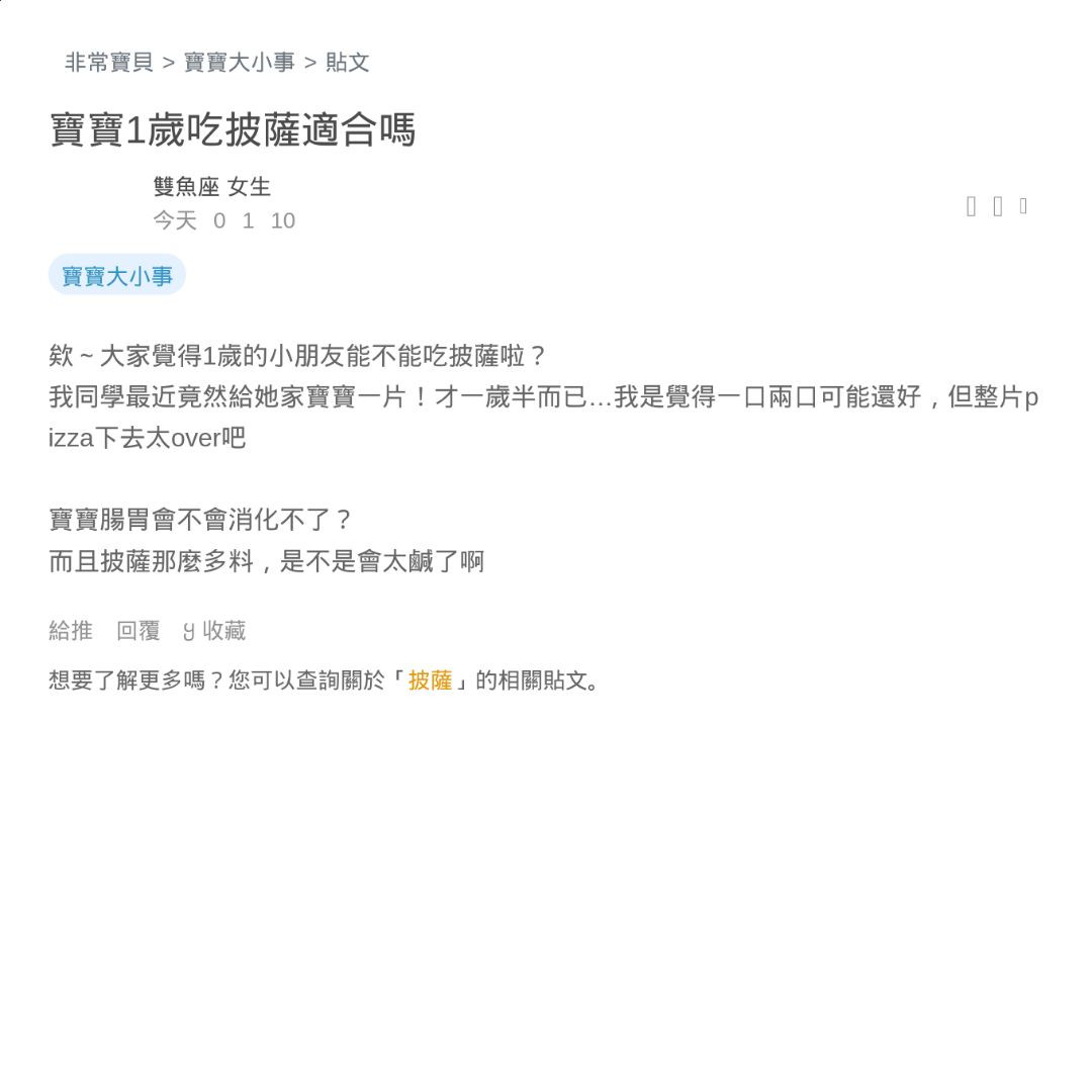 我同學最近竟然給她家寶寶一片!才一歲半而已…我是覺得一口兩口可能還好,但整片pizza下去太over吧