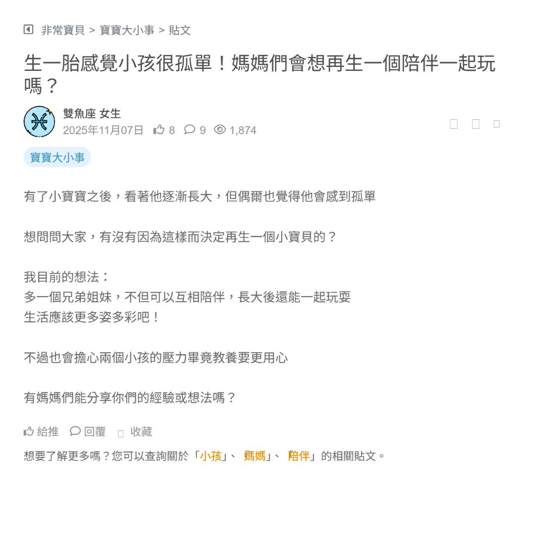 生一胎感覺小孩很孤單!媽媽們會想再生一個陪伴一起玩嗎?