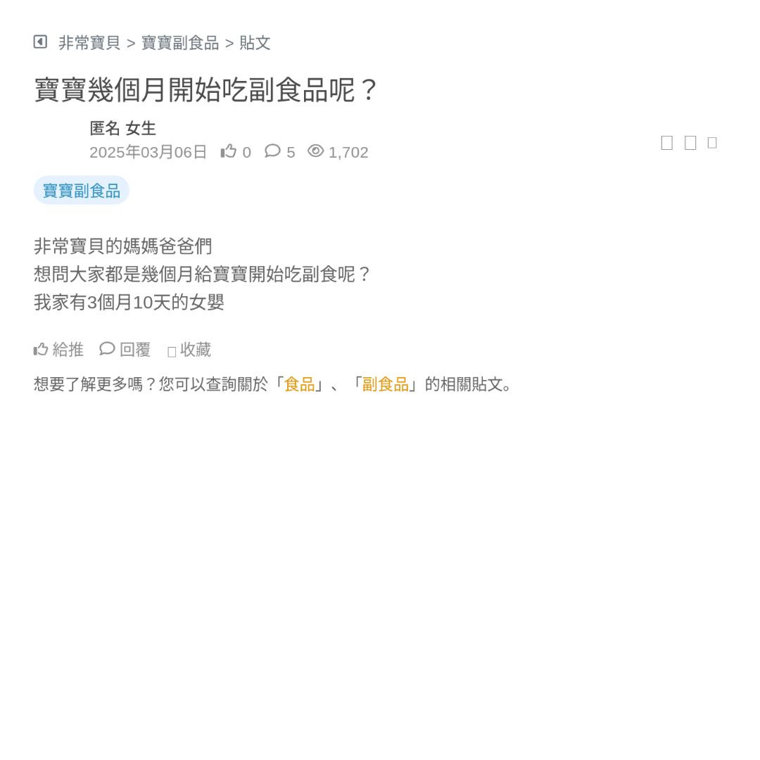 寶寶剛滿5個月 醫生說可以開始吃副食品了 想問大家一開始都餵什麼? 看更多